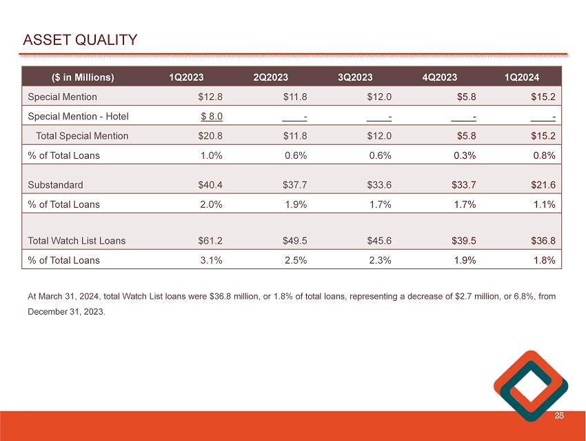 ASSET QUALITY 25 1Q2024 4Q2023 3Q2023 2Q2023 1Q2023 ($ in Millions) $15.2 $5.8 $12.0 $11.8 $12.8 Special Mention - - - - $ 8.0 Special Mention - Hotel $15.2 $5.8 $12.0 $11.8 $20.8 Total Special Mention 0.8% 0.3% 0.6% 0.6% 1.0% % of Total Loans $21.6 $33.7 $33.6 $37.7 $40.4 Substandard 1.1% 1.7% 1.7% 1.9% 2.0% % of Total Loans $36.8 $39.5 $45.6 $49.5 $61.2 Total Watch List Loans 1.8% 1.9% 2.3% 2.5% 3.1% % of Total Loans At March 31 , 2024 , total Watch List loans were $ 36 . 8 million, or 1 . 8 % of total loans, representing a decrease of $ 2 . 7 million , or 6 . 8 % , from December 31 , 2023 .