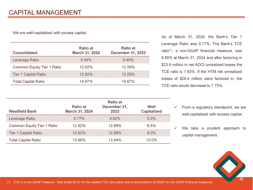 CAPITAL MANAGEMENT 26 We are well - capitalized with excess capital. Ratio at December 31, 2023 Ratio at March 31, 2024 Consolidated 9.40% 9.54% Leverage Ratio 12.59% 12.62% Common Equity Tier 1 Ratio 12.59% 12.62% Tier 1 Capital Ratio 14.67% 14.67% Total Capital Ratio As of March 31 , 2024 , the Bank’s Tier 1 Leverage Ratio was 9 . 77 % . The Bank’s TCE ratio ( 1 ) , a non - GAAP financial measure, was 8 . 85 % at March 31 , 2024 and after factoring in $ 23 . 6 million in net AOCI unrealized losses the TCE ratio is 7 . 93 % . If the HTM net unrealized losses of $ 28 . 4 million were factored in, the TCE ratio would decrease to 7 . 75 % . Well Capitalized Ratio at December 31, 2023 Ratio at March 31, 2024 Westfield Bank 5.0% 9.62% 9.77% Leverage Ratio 6.5% 12.88% 12.92% Common Equity Tier 1 Ratio 8.0% 12.88% 12.92% Tier 1 Capital Ratio 10.0% 13.94% 13.96% Total Capital Ratio (1) TCE is a non - GAAP measure. See slides 29 - 31 for the related TCE calculation and a reconciliation of GAAP to non - GAAP financial measures . x From a regulatory standpoint, we are well - capitalized with excess capital . x We take a prudent approach to capital management .