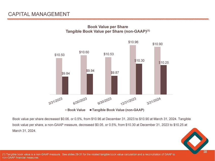 CAPITAL RETURN TO SHAREHOLDERS 27 # of Shares Year 2,189,276 2018 1,938,667 2019 1,391,496 2020 2,758,051 2021 720,975 2022 649,744 2023 200,000 1Q - 2024 Annual Dividends per Share Year $0.16 2018 $0.20 2019 $0.20 2020 $0.20 2021 $0.24 2022 $0.28 2023 $0.07 1Q - 2024 Share Repurchases Dividends On July 26 , 2022 , the Board of Directors authorized a stock repurchase plan (the “ 2022 Plan ”), pursuant to which the Company is authorized to repurchase up to 1 . 1 million shares, representing approximately 5 . 0 % of the Company’s outstanding common stock as of the time the 2022 Plan was announced . During the three months ended March 31 , 2024 , the Company repurchased 200 , 000 shares of common stock under the 2022 Plan, with an average price per share of $ 8 . 26 . As of March 31 , 2024 , there were 2 06 , 600 shares of common stock available for repurchase under the 2022 Plan .