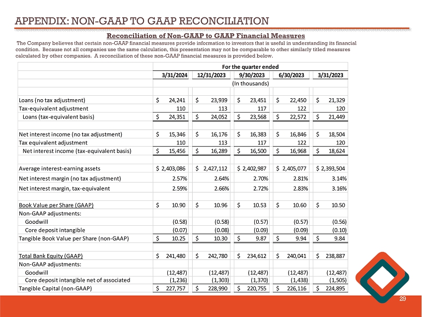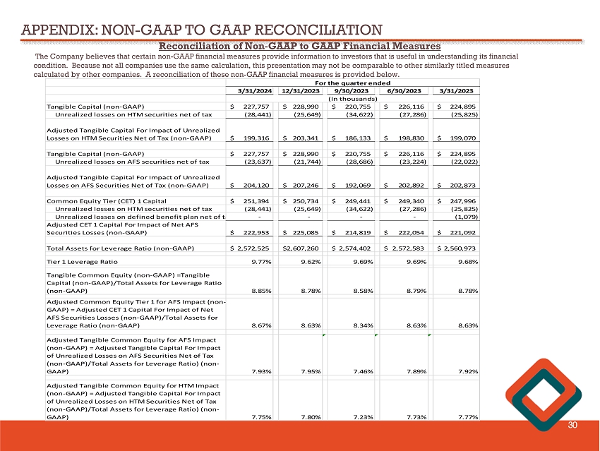 APPENDIX: NON - GAAP TO GAAP RECONCILIATION 29 Reconciliation of Non - GAAP to GAAP Financial Measures The Company believes that certain non - GAAP financial measures provide information to investors that is useful in understanding i ts financial condition. Because not all companies use the same calculation, this presentation may not be comparable to other similarly title d measures calculated by other companies. A reconciliation of these non - GAAP financial measures is provided below. 3/31/2024 12/31/2023 9/30/2023 6/30/2023 3/31/2023 Loans (no tax adjustment) 24,241$ 23,939$ 23,451$ 22,450$ 21,329$ Tax-equivalent adjustment 110 113 117 122 120 Loans (tax-equivalent basis) 24,351$ 24,052$ 23,568$ 22,572$ 21,449$ Net interest income (no tax adjustment) 15,346$ 16,176$ 16,383$ 16,846$ 18,504$ Tax equivalent adjustment 110 113 117 122 120 Net interest income (tax-equivalent basis) 15,456$ 16,289$ 16,500$ 16,968$ 18,624$ Average interest-earning assets 2,403,086$ 2,427,112$ 2,402,987$ 2,405,077$ 2,393,504$ Net interest margin (no tax adjustment) 2.57% 2.64% 2.70% 2.81% 3.14% Net interest margin, tax-equivalent 2.59% 2.66% 2.72% 2.83% 3.16% Book Value per Share (GAAP) 10.90$ 10.96$ 10.53$ 10.60$ 10.50$ Non-GAAP adjustments: Goodwill (0.58) (0.58) (0.57) (0.57) (0.56) Core deposit intangible (0.07) (0.08) (0.09) (0.09) (0.10) Tangible Book Value per Share (non-GAAP) 10.25$ 10.30$ 9.87$ 9.94$ 9.84$ Total Bank Equity (GAAP) 241,480$ 242,780$ 234,612$ 240,041$ 238,887$ Non-GAAP adjustments: Goodwill (12,487) (12,487) (12,487) (12,487) (12,487) Core deposit intangible net of associated (1,236) (1,303) (1,370) (1,438) (1,505) Tangible Capital (non-GAAP) 227,757$ 228,990$ 220,755$ 226,116$ 224,895$ For the quarter ended (In thousands)