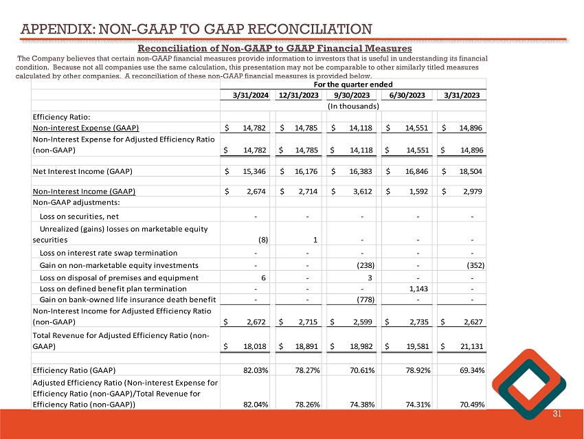 APPENDIX: NON - GAAP TO GAAP RECONCILIATION 30 Reconciliation of Non - GAAP to GAAP Financial Measures The Company believes that certain non - GAAP financial measures provide information to investors that is useful in understanding i ts financial condition. Because not all companies use the same calculation, this presentation may not be comparable to other similarly title d measures calculated by other companies. A reconciliation of these non - GAAP financial measures is provided below. 3/31/2024 12/31/2023 9/30/2023 6/30/2023 3/31/2023 Tangible Capital (non-GAAP) 227,757$ 228,990$ 220,755$ 226,116$ 224,895$ Unrealized losses on HTM securities net of tax (28,441) (25,649) (34,622) (27,286) (25,825) Adjusted Tangible Capital For Impact of Unrealized Losses on HTM Securities Net of Tax (non-GAAP) 199,316$ 203,341$ 186,133$ 198,830$ 199,070$ Tangible Capital (non-GAAP) 227,757$ 228,990$ 220,755$ 226,116$ 224,895$ Unrealized losses on AFS securities net of tax (23,637) (21,744) (28,686) (23,224) (22,022) Adjusted Tangible Capital For Impact of Unrealized Losses on AFS Securities Net of Tax (non-GAAP) 204,120$ 207,246$ 192,069$ 202,892$ 202,873$ Common Equity Tier (CET) 1 Capital 251,394$ 250,734$ 249,441$ 249,340$ 247,996$ Unrealized losses on HTM securities net of tax (28,441) (25,649) (34,622) (27,286) (25,825) Unrealized losses on defined benefit plan net of tax - - - - (1,079) Adjusted CET 1 Capital For Impact of Net AFS Securities Losses (non-GAAP) 222,953$ 225,085$ 214,819$ 222,054$ 221,092$ Total Assets for Leverage Ratio (non-GAAP) 2,572,525$ 2,607,260$ 2,574,402$ 2,572,583$ 2,560,973$ Tier 1 Leverage Ratio 9.77% 9.62% 9.69% 9.69% 9.68% Tangible Common Equity (non-GAAP) =Tangible Capital (non-GAAP)/Total Assets for Leverage Ratio (non-GAAP) 8.85% 8.78% 8.58% 8.79% 8.78% Adjusted Common Equity Tier 1 for AFS Impact (non- GAAP) = Adjusted CET 1 Capital For Impact of Net AFS Securities Losses (non-GAAP)/Total Assets for Leverage Ratio (non-GAAP) 8.67% 8.63% 8.34% 8.63% 8.63% Adjusted Tangible Common Equity for AFS Impact (non-GAAP) = Adjusted Tangible Capital For Impact of Unrealized Losses on AFS Securities Net of Tax (non-GAAP)/Total Assets for Leverage Ratio) (non- GAAP) 7.93% 7.95% 7.46% 7.89% 7.92% Adjusted Tangible Common Equity for HTM Impact (non-GAAP) = Adjusted Tangible Capital For Impact of Unrealized Losses on HTM Securities Net of Tax (non-GAAP)/Total Assets for Leverage Ratio) (non- GAAP) 7.75% 7.80% 7.23% 7.73% 7.77% For the quarter ended (In thousands)