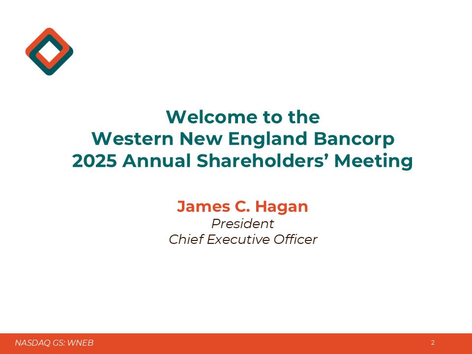 2 NASDAQ GS: WNEB Welcome to the Western New England Bancorp 2025 Annual Shareholders’ Meeting James C. Hagan President Chief Executive Officer 2