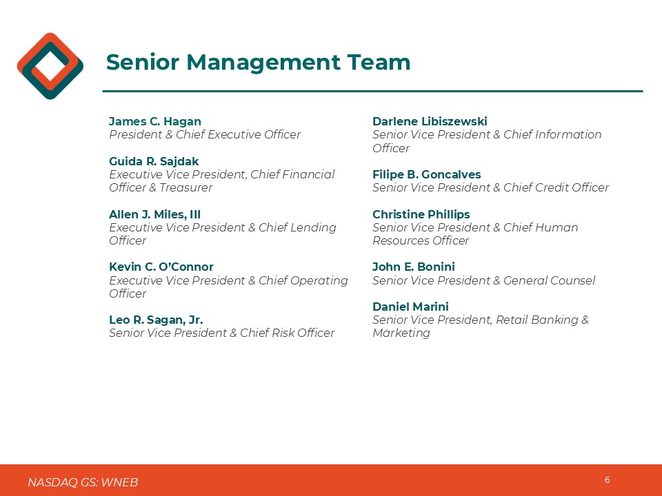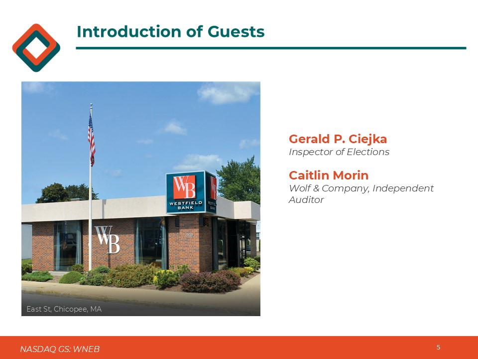 5 NASDAQ GS: WNEB Gerald P. Ciejka Inspector of Elections Caitlin Morin Wolf & Company, Independent Auditor 5 Introduction of Guests East St, Chicopee, MA