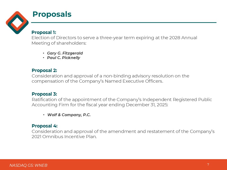 Proposals 7 NASDAQ GS: WNEB Proposal 1: Election of Directors to serve a three - year term expiring at the 2028 Annual Meeting of shareholders: • Gary G. Fitzgerald • Paul C. Picknelly Proposal 2: Consideration and approval of a non - binding advisory resolution on the compensation of the Company’s Named Executive Officers. Proposal 3: Ratification of the appointment of the Company’s Independent Registered Public Accounting Firm for the fiscal year ending December 31, 2025: • Wolf & Company, P.C. Proposal 4: Consideration and approval of the amendment and restatement of the Company’s 2021 Omnibus Incentive Plan. 7
