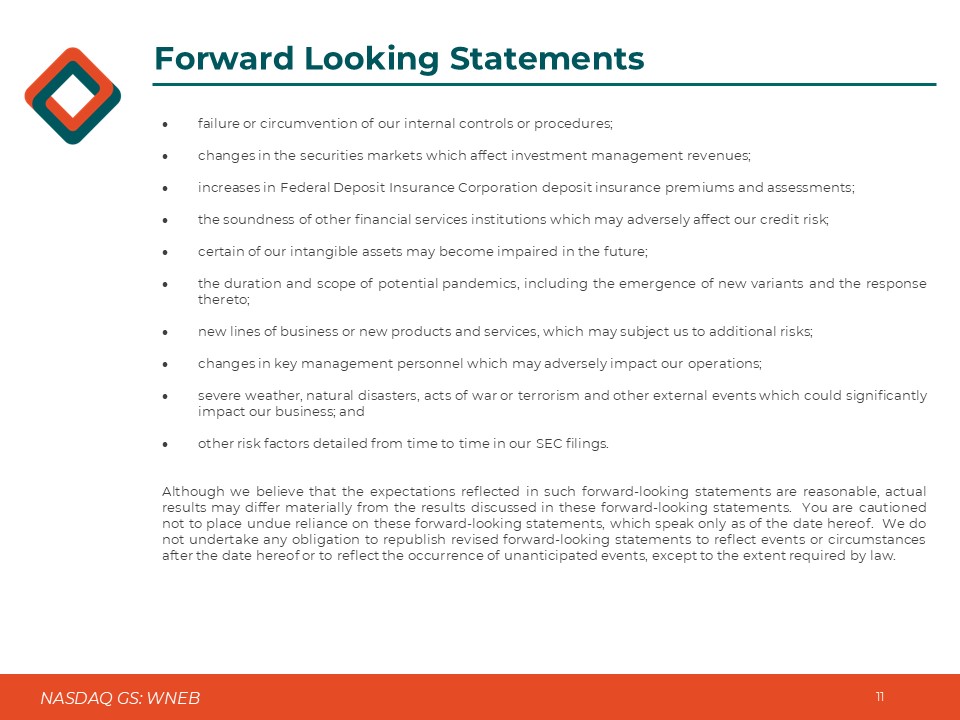 Forward Looking Statements 10 NASDAQ GS: WNEB We may, from time to time, make written or oral “forward - looking statements” within the meaning of the Private Securities Litigation Reform Act of 1995 , including statements contained in our filings with the Securities and Exchange Commission (the “SEC”), our reports to shareholders and in other communications by us . This Investor Presentation contains “forward - looking statements” with respect to the Company’s financial condition, liquidity, results of operations, future performance, and business . Forward - looking statements may be identified by the use of such words as “believe,” “expect,” “anticipate,” “should,” “planned,” “estimated,” and “potential . ” Examples of forward - looking statements include, but are not limited to, estimates with respect to our financial condition, results of operations and business that are subject to various factors which could cause actual results to differ materially from these estimates . These factors include, but are not limited to :  unpredictable changes in general economic or political conditions, financial markets, fiscal, monetary and regulatory policies, including actual or potential stress in the banking industry ;  unstable political and economic conditions, including changes in tariff policies, which could materially impact credit quality trends and the ability to generate loans and gather deposits ;  inflation and governmental responses to inflation, including recent sustained increases and potential future increases in interest rates that reduce margins ;  the effect on our operations of governmental legislation and regulation, including changes in accounting regulation or standards, the nature and timing of the adoption and effectiveness of new requirements under the Dodd - Frank Wall Street Reform and Consumer Protection Act of 2010 , Basel guidelines, capital requirements and other applicable laws and regulations ;  significant changes in accounting, tax or regulatory practices or requirements ;  new legal obligations or liabilities or unfavorable resolutions of litigation ;  disruptive technologies in payment systems and other services traditionally provided by banks ;  the highly competitive industry and market area in which we operate ;  operational risks or risk management failures by us or critical third parties, including without limitation with respect to data processing, information systems, cybersecurity, technological changes, vendor issues, business interruption, and fraud risks ; 10