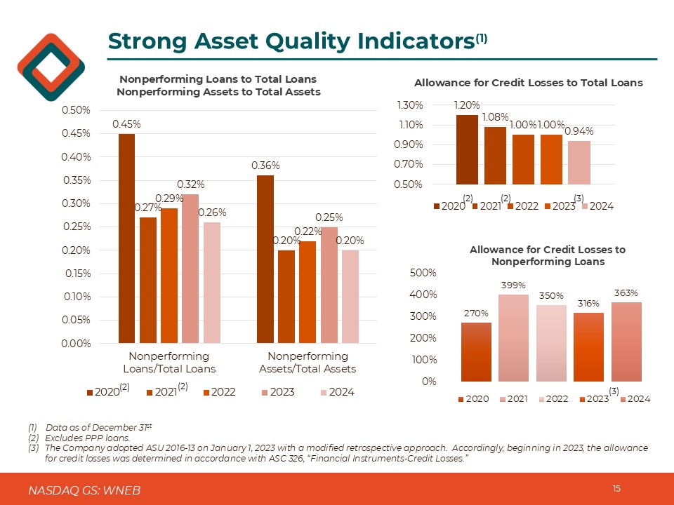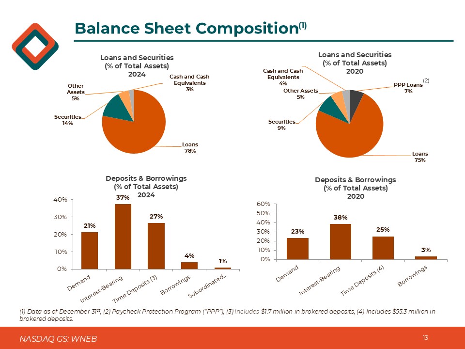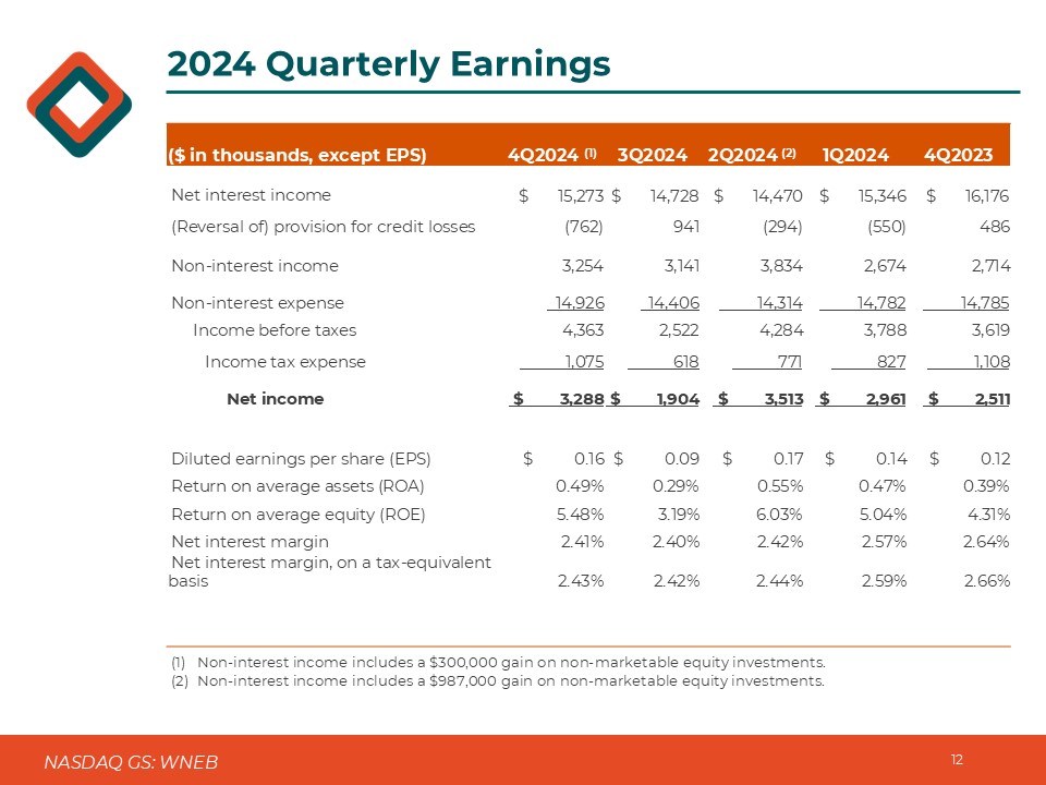 12 2024 Quarterly Earnings NASDAQ GS: WNEB 12 4Q2023 1Q2024 2Q2024 (2) 3Q2024 4Q2024 (1) ($ in thousands, except EPS) $ 16,176 $ 15,346 $ 14,470 $ 14,728 $ 15,273 Net interest income 486 (550) (294) 941 (762) (Reversal of) provision for credit losses 2,714 2,674 3,834 3,141 3,254 Non - interest income 14,785 14,782 14,314 14,406 14,926 Non - interest expense 3,619 3,788 4,284 2,522 4,363 Income before taxes 1,108 827 771 618 1,075 Income tax expense $ 2,511 $ 2,961 $ 3,513 $ 1,904 $ 3,288 Net income $ 0.12 $ 0.14 $ 0.17 $ 0.09 $ 0.16 Diluted earnings per share (EPS) 0.39% 0.47% 0.55% 0.29% 0.49% Return on average assets (ROA) 4.31% 5.04% 6.03% 3.19% 5.48% Return on average equity (ROE) 2.64% 2.57% 2.42% 2.40% 2.41% Net interest margin 2.66% 2.59% 2.44% 2.42% 2.43% Net interest margin, on a tax - equivalent basis (1) Non - interest income includes a $300,000 gain on non - marketable equity investments. (2) Non - interest income includes a $987,000 gain on non - marketable equity investments.