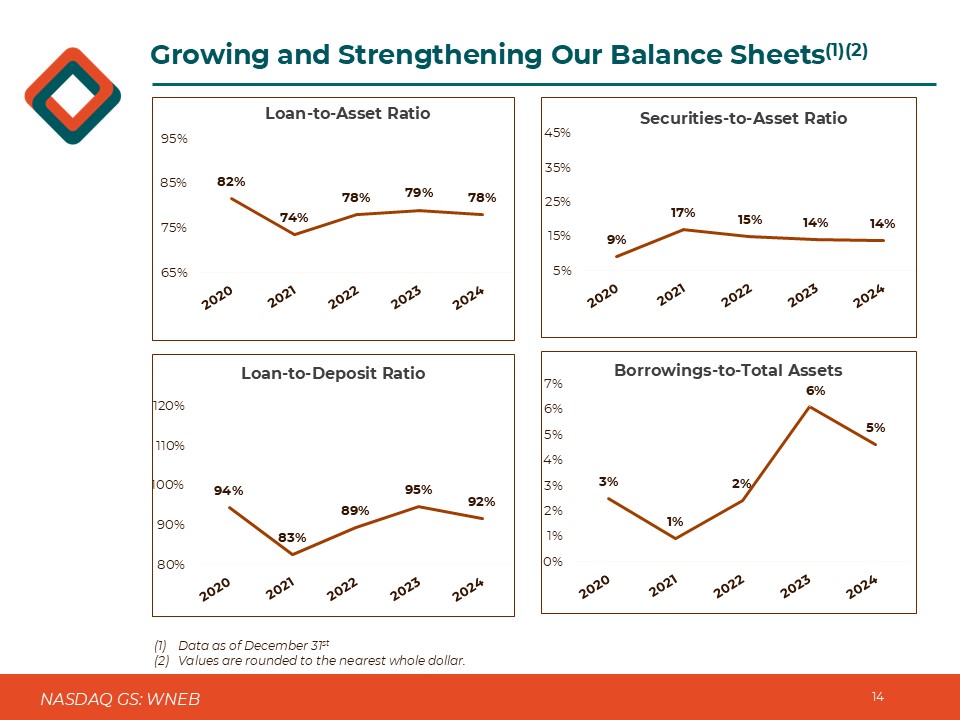 13 Balance Sheet Composition NASDAQ GS: WNEB 13 PPP Loans 7% Loans 75% Securities 9% Other Assets 5% Cash and Cash Equivalents 4% Loans and Securities (% of Total Assets) 2020 (2) (1) Data as of December 31 st , (2) Paycheck Protection Program (“PPP”), (3) Includes $1.7 million in brokered deposits, (4) Includes $55.3 million in brokered deposits. Loans 78% Securities 14% Other Assets 5% Cash and Cash Equivalents 3% Loans and Securities (% of Total Assets) 2024 21% 37% 27% 4% 1% 0% 10% 20% 30% 40% Deposits & Borrowings (% of Total Assets) 2024 23% 38% 25% 3% 0% 10% 20% 30% 40% 50% 60% Deposits & Borrowings (% of Total Assets) 2020 (1)