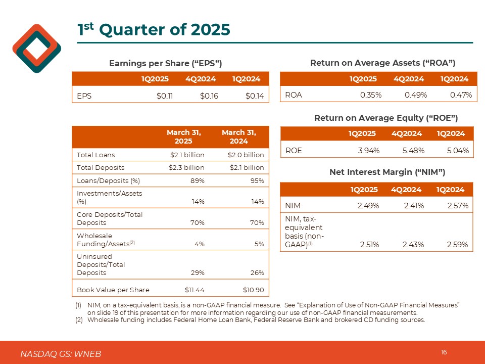 15 Strong Asset Quality Indicators NASDAQ GS: WNEB 15 (1) Data as of December 31 st (2) Excludes PPP loans. (3) The Company adopted ASU 2016 - 13 on January 1, 2023 with a modified retrospective approach. Accordingly, beginning in 2023, the allo wance for credit losses was determined in accordance with ASC 326, “Financial Instruments - Credit Losses .” 1.20% 1.08% 1.00% 1.00% 0.94% 0.50% 0.70% 0.90% 1.10% 1.30% Allowance for Credit Losses to Total Loans 2020 2021 2022 2023 2024 (2) (3) (2) 270% 399% 350% 316% 363% 0% 100% 200% 300% 400% 500% Allowance for Credit Losses to Nonperforming Loans 2020 2021 2022 2023 2024 (3) 0.45% 0.36% 0.27% 0.20% 0.29% 0.22% 0.32% 0.25% 0.26% 0.20% 0.00% 0.05% 0.10% 0.15% 0.20% 0.25% 0.30% 0.35% 0.40% 0.45% 0.50% Nonperforming Loans/Total Loans Nonperforming Assets/Total Assets Nonperforming Loans to Total Loans Nonperforming Assets to Total Assets 2020 2021 2022 2023 2024 (2) (2) (1)
