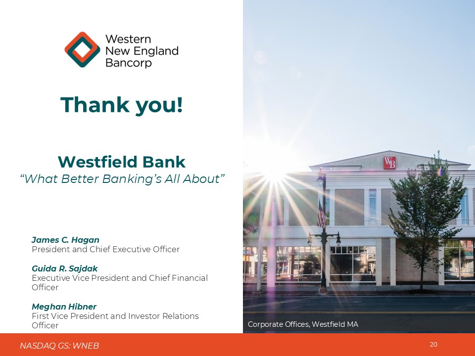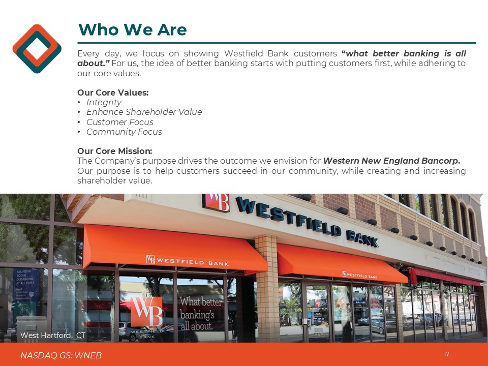 17 Who We Are Every day, we focus on showing Westfield Bank customers “ what better banking is all about . ” For us, the idea of better banking starts with putting customers first, while adhering to our core values . Our Core Values : • Integrity • Enhance Shareholder Value • Customer Focus • Community Focus Our Core Mission : The Company’s purpose drives the outcome we envision for Western New England Bancorp . Our purpose is to help customers succeed in our community, while creating and increasing shareholder value . West Hartford, CT NASDAQ GS: WNEB 17