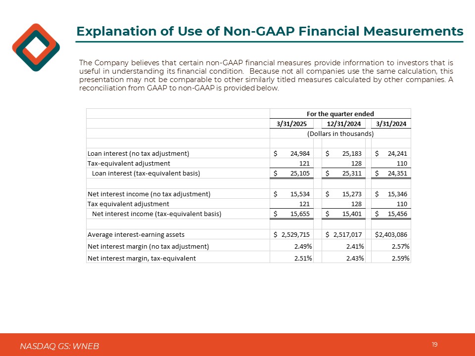 19 Explanation of Use of Non - GAAP Financial Measurements NASDAQ GS: WNEB 19 The Company believes that certain non - GAAP financial measures provide information to investors that is useful in understanding its financial condition . Because not all companies use the same calculation, this presentation may not be comparable to other similarly titled measures calculated by other companies . A reconciliation from GAAP to non - GAAP is provided below . 3/31/2025 12/31/2024 3/31/2024 Loan interest (no tax adjustment) 24,984$ 25,183$ 24,241$ Tax-equivalent adjustment 121 128 110 Loan interest (tax-equivalent basis) 25,105$ 25,311$ 24,351$ Net interest income (no tax adjustment) 15,534$ 15,273$ 15,346$ Tax equivalent adjustment 121 128 110 Net interest income (tax-equivalent basis) 15,655$ 15,401$ 15,456$ Average interest-earning assets 2,529,715$ 2,517,017$ 2,403,086$ Net interest margin (no tax adjustment) 2.49% 2.41% 2.57% Net interest margin, tax-equivalent 2.51% 2.43% 2.59% For the quarter ended (Dollars in thousands)