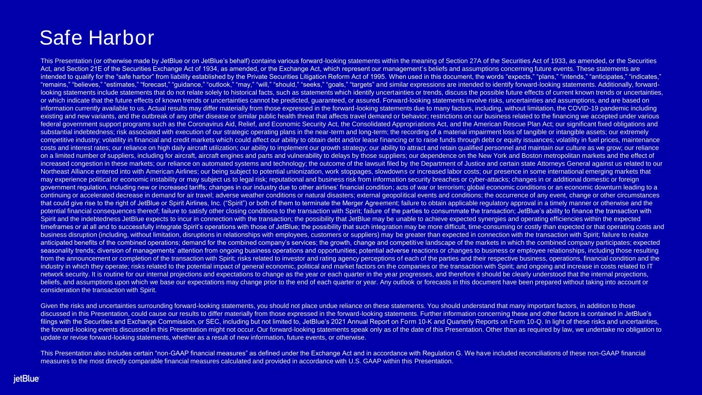 2 Safe Harbor This Presentation (or otherwise made by JetBlue or on JetBlue’s behalf) contains various forward-looking statements within the meaning of Section 27A of the Securities Act of 1933, as amended, or the Securities Act, and Section 21E of the Securities Exchange Act of 1934, as amended, or the Exchange Act, which represent our management’s beliefs and assumptions concerning future events. These statements are intended to qualify for the “safe harbor” from liability established by the Private Securities Litigation Reform Act of 1995. When used in this document, the words “expects,” “plans,” “intends,” “anticipates,” “indicates,” “remains,” “believes,” “estimates,” “forecast,” “guidance,” “outlook,” “may,” “will,” “should,” “seeks,” “goals,” “targets” and similar expressions are intended to identify forward-looking statements. Additionally, forward- looking statements include statements that do not relate solely to historical facts, such as statements which identify uncertainties or trends, discuss the possible future effects of current known trends or uncertainties, or which indicate that the future effects of known trends or uncertainties cannot be predicted, guaranteed, or assured. Forward-looking statements involve risks, uncertainties and assumptions, and are based on information currently available to us. Actual results may differ materially from those expressed in the forward-looking statements due to many factors, including, without limitation, the COVID-19 pandemic including existing and new variants, and the outbreak of any other disease or similar public health threat that affects travel demand or behavior; restrictions on our business related to the financing we accepted under various federal government support programs such as the Coronavirus Aid, Relief, and Economic Security Act, the Consolidated Appropriations Act, and the American Rescue Plan Act; our significant fixed obligations and substantial indebtedness; risk associated with execution of our strategic operating plans in the near-term and long-term; the recording of a material impairment loss of tangible or intangible assets; our extremely competitive industry; volatility in financial and credit markets which could affect our ability to obtain debt and/or lease financing or to raise funds through debt or equity issuances; volatility in fuel prices, maintenance costs and interest rates; our reliance on high daily aircraft utilization; our ability to implement our growth strategy; our ability to attract and retain qualified personnel and maintain our culture as we grow; our reliance on a limited number of suppliers, including for aircraft, aircraft engines and parts and vulnerability to delays by those suppliers; our dependence on the New York and Boston metropolitan markets and the effect of increased congestion in these markets; our reliance on automated systems and technology; the outcome of the lawsuit filed by the Department of Justice and certain state Attorneys General against us related to our Northeast Alliance entered into with American Airlines; our being subject to potential unionization, work stoppages, slowdowns or increased labor costs; our presence in some international emerging markets that may experience political or economic instability or may subject us to legal risk; reputational and business risk from information security breaches or cyber-attacks; changes in or additional domestic or foreign government regulation, including new or increased tariffs; changes in our industry due to other airlines’ financial condition ; acts of war or terrorism; global economic conditions or an economic downturn leading to a continuing or accelerated decrease in demand for air travel; adverse weather conditions or natural disasters; external geopolitical events and conditions; the occurrence of any event, change or other circumstances that could give rise to the right of JetBlue or Spirit Airlines, Inc. (“Spirit”) or both of them to terminate the Merger Agreement; failure to obtain applicable regulatory approval in a timely manner or otherwise and the potential financial consequences thereof; failure to satisfy other closing conditions to the transaction with Spirit; failure of the parties to consummate the transaction; JetBlue’s ability to finance the transaction with Spirit and the indebtedness JetBlue expects to incur in connection with the transaction; the possibility that JetBlue may be unable to achieve expected synergies and operating efficiencies within the expected timeframes or at all and to successfully integrate Spirit’s operations with those of JetBlue; the possibility that such integration may be more difficult, time-consuming or costly than expected or that operating costs and business disruption (including, without limitation, disruptions in relationships with employees, customers or suppliers) may be greater than expected in connection with the transaction with Spirit; failure to realize anticipated benefits of the combined operations; demand for the combined company’s services; the growth, change and competitive landscape of the markets in which the combined company participates; expected seasonality trends; diversion of managements’ attention from ongoing business operations and opportunities; potential adverse reactions or changes to business or employee relationships, including those resulting from the announcement or completion of the transaction with Spirit; risks related to investor and rating agency perceptions of each of the parties and their respective business, operations, financial condition and the industry in which they operate; risks related to the potential impact of general economic, political and market factors on the companies or the transaction with Spirit; and ongoing and increase in costs related to IT network security. It is routine for our internal projections and expectations t