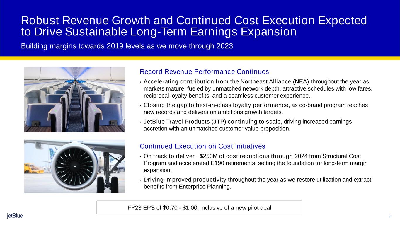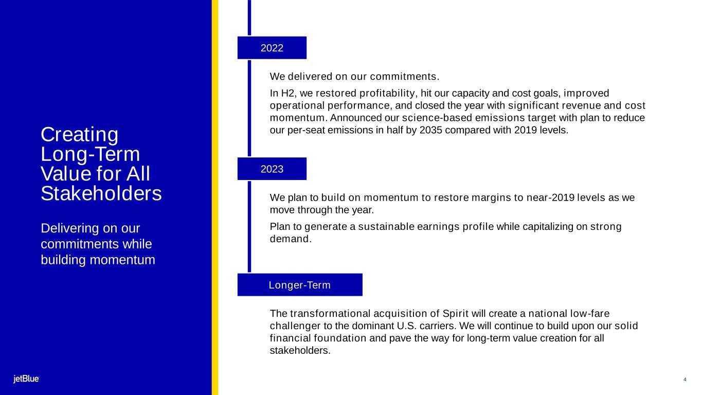 4 2022 We delivered on our commitments. In H2, we restored profitability, hit our capacity and cost goals, improved operational performance, and closed the year with significant revenue and cost momentum. Announced our science-based emissions target with plan to reduce our per-seat emissions in half by 2035 compared with 2019 levels. 2023 We plan to build on momentum to restore margins to near-2019 levels as we move through the year. Plan to generate a sustainable earnings profile while capitalizing on strong demand. Longer-Term The transformational acquisition of Spirit will create a national low-fare challenger to the dominant U.S. carriers. We will continue to build upon our solid financial foundation and pave the way for long-term value creation for all stakeholders. Creating Long-Term Value for All Stakeholders Delivering on our commitments while building momentum