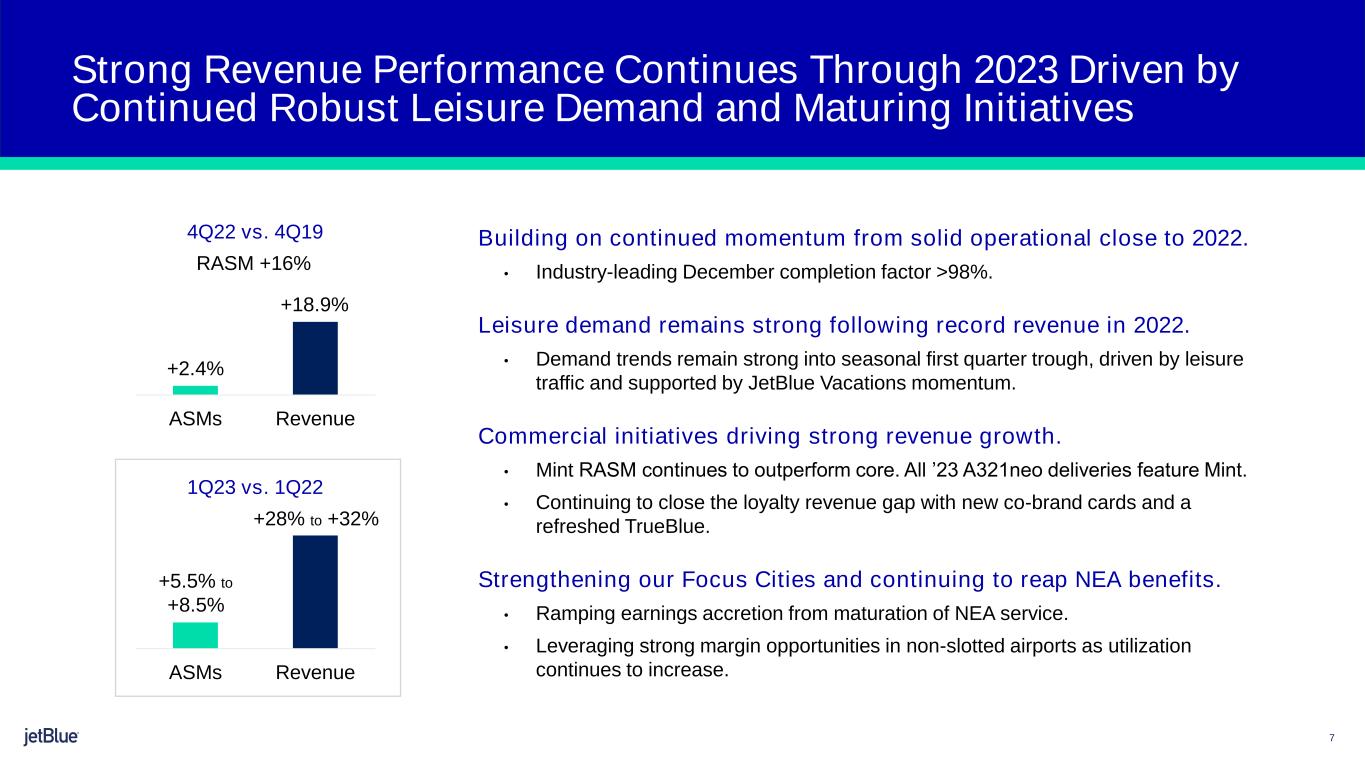 7 Building on continued momentum from solid operational close to 2022. • Industry-leading December completion factor >98%. Leisure demand remains strong following record revenue in 2022. • Demand trends remain strong into seasonal first quarter trough, driven by leisure traffic and supported by JetBlue Vacations momentum. Commercial initiatives driving strong revenue growth. • Mint RASM continues to outperform core. All ’23 A321neo deliveries feature Mint. • Continuing to close the loyalty revenue gap with new co-brand cards and a refreshed TrueBlue. Strengthening our Focus Cities and continuing to reap NEA benefits. • Ramping earnings accretion from maturation of NEA service. • Leveraging strong margin opportunities in non-slotted airports as utilization continues to increase. Strong Revenue Performance Continues Through 2023 Driven by Continued Robust Leisure Demand and Maturing Initiatives ASMs Revenue 1Q23 vs. 1Q22 +5.5% to +8.5% +28% to +32% ASMs Revenue 4Q22 vs. 4Q19 +2.4% +18.9% RASM +16%