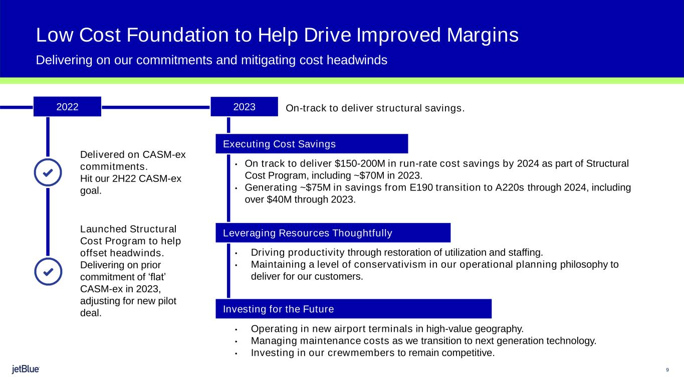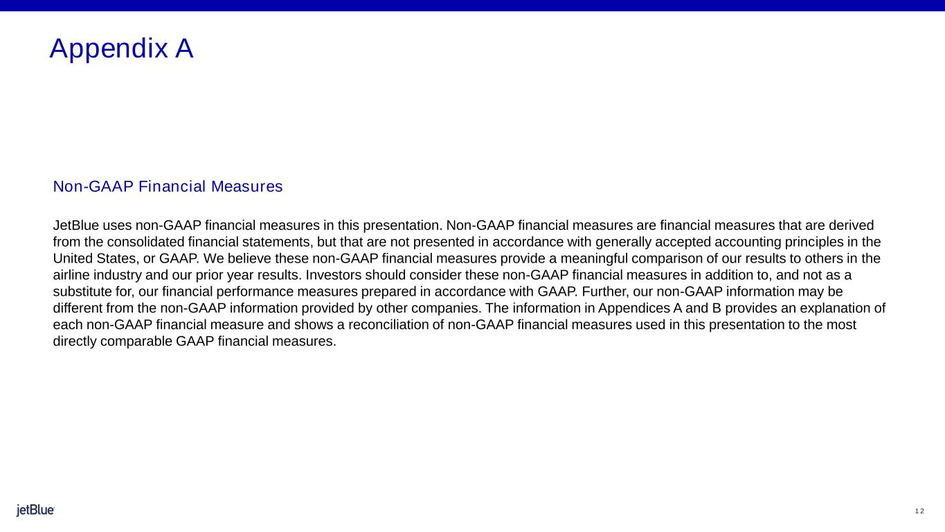 1 2 Non-GAAP Financial Measures JetBlue uses non-GAAP financial measures in this presentation. Non-GAAP financial measures are financial measures that are derived from the consolidated financial statements, but that are not presented in accordance with generally accepted accounting principles in the United States, or GAAP. We believe these non-GAAP financial measures provide a meaningful comparison of our results to others in the airline industry and our prior year results. Investors should consider these non-GAAP financial measures in addition to, and not as a substitute for, our financial performance measures prepared in accordance with GAAP. Further, our non-GAAP information may be different from the non-GAAP information provided by other companies. The information in Appendices A and B provides an explanation of each non-GAAP financial measure and shows a reconciliation of non-GAAP financial measures used in this presentation to the most directly comparable GAAP financial measures. Appendix A