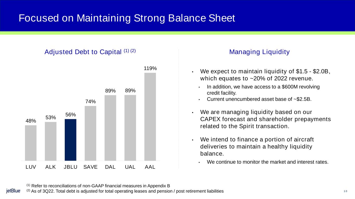 1 0 (1) Refer to reconciliations of non-GAAP financial measures in Appendix B (2) As of 3Q22. Total debt is adjusted for total operating leases and pension / post retirement liabilities Adjusted Debt to Capital (1) (2) 48% 53% 56% 74% 89% 89% 119% LUV ALK JBLU SAVE DAL UAL AAL Managing Liquidity • We expect to maintain liquidity of $1.5 - $2.0B, which equates to ~20% of 2022 revenue. • In addition, we have access to a $600M revolving credit facility. • Current unencumbered asset base of ~$2.5B. • We are managing liquidity based on our CAPEX forecast and shareholder prepayments related to the Spirit transaction. • We intend to finance a portion of aircraft deliveries to maintain a healthy liquidity balance. • We continue to monitor the market and interest rates. Focused on Maintaining Strong Balance Sheet