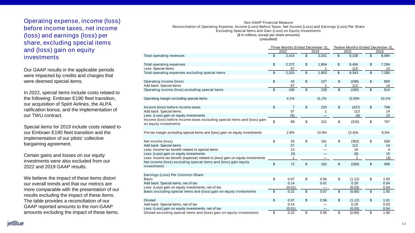1 4 Operating expense, income (loss) before income taxes, net income (loss) and earnings (loss) per share, excluding special items and (loss) gain on equity investments Our GAAP results in the applicable periods were impacted by credits and charges that were deemed special items. In 2022, special items include costs related to the following: Embraer E190 fleet transition, our acquisition of Spirit Airlines, the ALPA ratification bonus, and the implementation of our TWU contract. Special items for 2019 include costs related to our Embraer E190 fleet transition and the implementation of our pilots' collective bargaining agreement. Certain gains and losses on our equity investments were also excluded from our 2022 and 2019 GAAP results. We believe the impact of these items distort our overall trends and that our metrics are more comparable with the presentation of our results excluding the impact of these items. The table provides a reconciliation of our GAAP reported amounts to the non-GAAP amounts excluding the impact of these items. Non-GAAP Financial Measure Reconciliation of Operating Expense, Income (Loss) Before Taxes, Net Income (Loss) and Earnings (Loss) Per Share Excluding Special Items and Gain (Loss) on Equity Investments ($ in millions, except per share amounts) (unaudited) Three Months Ended December 31, Twelve Months Ended December 31, 2022 2019 2022 2019 Total operating revenues $ 2,415 $ 2,031 $ 9,158 $ 8,094 Total operating expenses $ 2,372 $ 1,804 $ 9,456 $ 7,294 Less: Special items 57 1 113 14 Total operating expenses excluding special items $ 2,315 $ 1,803 $ 9,343 $ 7,280 Operating income (loss) $ 43 $ 227 $ (298) $ 800 Add back: Special items 57 1 113 14 Operating income (loss) excluding special items $ 100 $ 228 $ (185) $ 814 Operating margin excluding special items 4.1% 11.2% (2.0)% 10.1% Income (loss) before income taxes $ 7 $ 220 $ (437) $ 768 Add back: Special items 57 1 113 14 Less: (Loss) gain on equity investments (5) — (9) 15 Income (loss) before income taxes excluding special items and (loss) gain on equity investments $ 69 $ 221 $ (315) $ 767 Pre-tax margin excluding special items and (loss) gain on equity investments 2.8% 10.9% (3.4)% 9.5% Net income (loss) $ 24 $ 161 $ (362) $ 569 Add back: Special items 57 1 113 14 Less: Income tax benefit related to special items 13 — 19 4 Less: (Loss) gain on equity investments (5) — (9) 15 Less: Income tax benefit (expense) related to (loss) gain on equity investments 1 — 1 (4) Net income (loss) excluding special items and (loss) gain equity investments $ 72 $ 162 $ (260) $ 568 Earnings (Loss) Per Common Share: Basic $ 0.07 $ 0.56 $ (1.12) $ 1.92 Add back: Special items, net of tax 0.14 0.01 0.29 0.04 Less: (Loss) gain on equity investments, net of tax (0.01) — (0.03) 0.04 Basic excluding special items and (loss) gain on equity investments $ 0.22 $ 0.57 $ (0.80) $ 1.92 Diluted $ 0.07 $ 0.56 $ (1.12) $ 1.91 Add back: Special items, net of tax 0.14 — 0.29 0.03 Less: (Loss) gain on equity investments, net of tax (0.01) — (0.03) 0.04 Diluted excluding special items and (loss) gain on equity investments $ 0.22 $ 0.56 $ (0.80) $ 1.90
