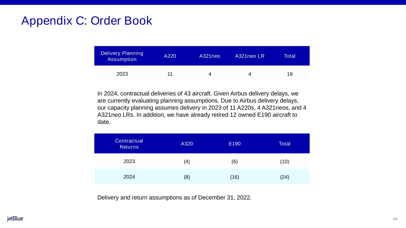 1 6 Delivery Planning Assumption A220 A321neo A321neo LR Total 2023 11 4 4 19 Delivery and return assumptions as of December 31, 2022. In 2024, contractual deliveries of 43 aircraft. Given Airbus delivery delays, we are currently evaluating planning assumptions. Due to Airbus delivery delays, our capacity planning assumes delivery in 2023 of 11 A220s, 4 A321neos, and 4 A321neo LRs. In addition, we have already retired 12 owned E190 aircraft to date. Appendix C: Order Book Contractual Returns A320 E190 Total 2023 (4) (6) (10) 2024 (8) (16) (24)