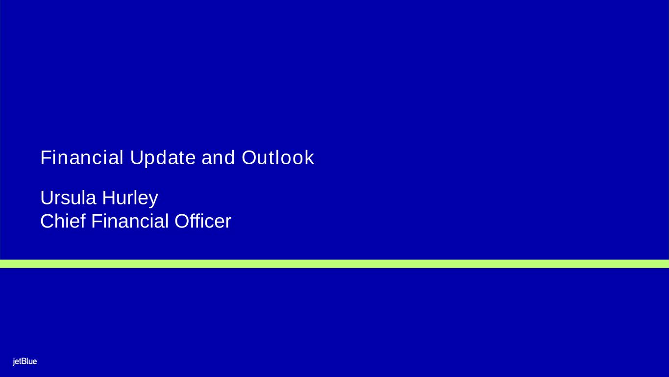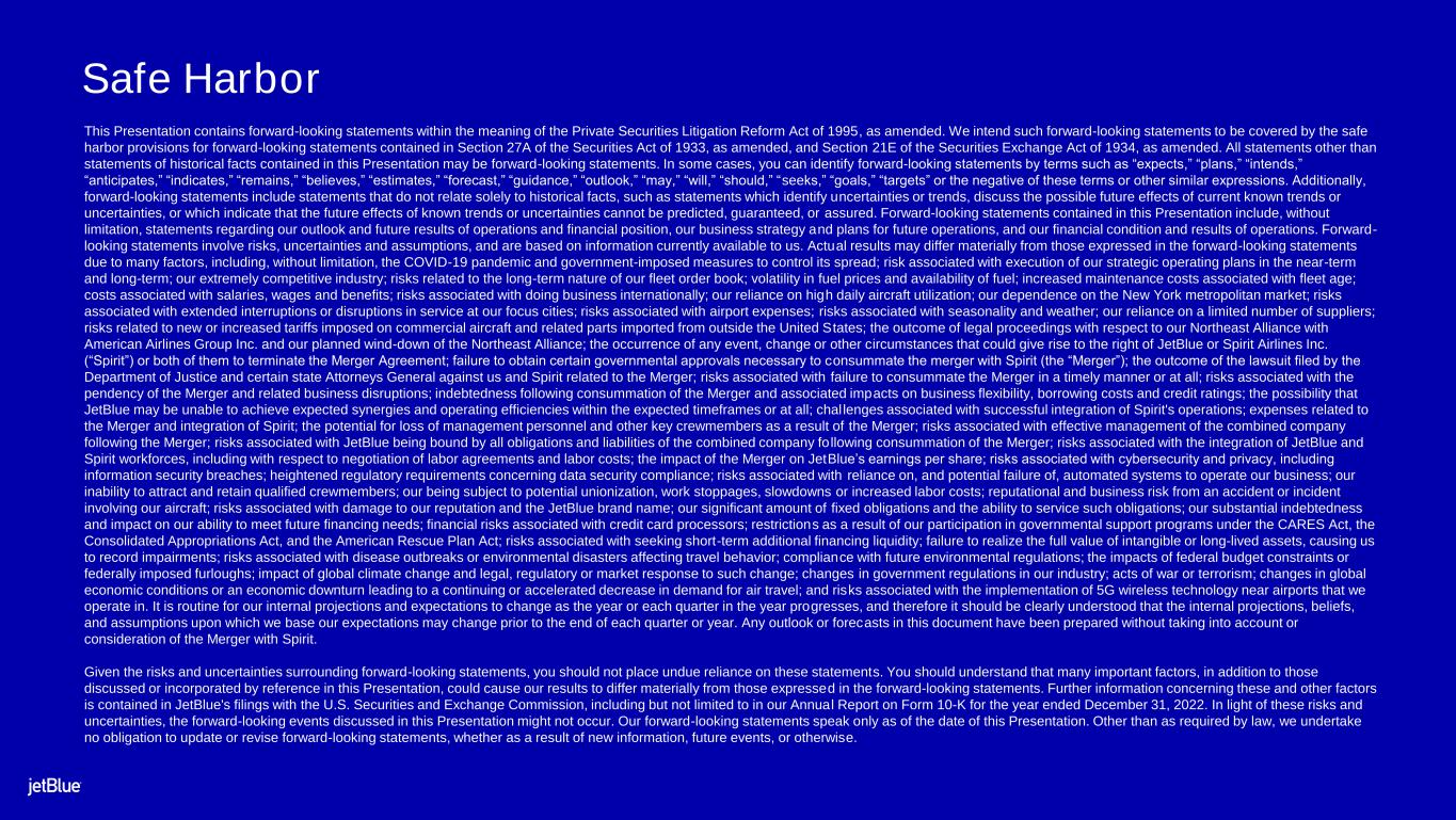 2 Safe Harbor This Presentation contains forward-looking statements within the meaning of the Private Securities Litigation Reform Act of 1995, as amended. We intend such forward-looking statements to be covered by the safe harbor provisions for forward-looking statements contained in Section 27A of the Securities Act of 1933, as amended, and Section 21E of the Securities Exchange Act of 1934, as amended. All statements other than statements of historical facts contained in this Presentation may be forward-looking statements. In some cases, you can identify forward-looking statements by terms such as “expects,” “plans,” “intends,” “anticipates,” “indicates,” “remains,” “believes,” “estimates,” “forecast,” “guidance,” “outlook,” “may,” “will,” “should,” “seeks,” “goals,” “targets” or the negative of these terms or other similar expressions. Additionally, forward-looking statements include statements that do not relate solely to historical facts, such as statements which identify uncertainties or trends, discuss the possible future effects of current known trends or uncertainties, or which indicate that the future effects of known trends or uncertainties cannot be predicted, guaranteed, or assured. Forward-looking statements contained in this Presentation include, without limitation, statements regarding our outlook and future results of operations and financial position, our business strategy and plans for future operations, and our financial condition and results of operations. Forward- looking statements involve risks, uncertainties and assumptions, and are based on information currently available to us. Actual results may differ materially from those expressed in the forward-looking statements due to many factors, including, without limitation, the COVID-19 pandemic and government-imposed measures to control its spread; risk associated with execution of our strategic operating plans in the near-term and long-term; our extremely competitive industry; risks related to the long-term nature of our fleet order book; volatility in fuel prices and availability of fuel; increased maintenance costs associated with fleet age; costs associated with salaries, wages and benefits; risks associated with doing business internationally; our reliance on high daily aircraft utilization; our dependence on the New York metropolitan market; risks associated with extended interruptions or disruptions in service at our focus cities; risks associated with airport expenses; risks associated with seasonality and weather; our reliance on a limited number of suppliers; risks related to new or increased tariffs imposed on commercial aircraft and related parts imported from outside the United States; the outcome of legal proceedings with respect to our Northeast Alliance with American Airlines Group Inc. and our planned wind-down of the Northeast Alliance; the occurrence of any event, change or other circumstances that could give rise to the right of JetBlue or Spirit Airlines Inc. (“Spirit”) or both of them to terminate the Merger Agreement; failure to obtain certain governmental approvals necessary to consummate the merger with Spirit (the “Merger”); the outcome of the lawsuit filed by the Department of Justice and certain state Attorneys General against us and Spirit related to the Merger; risks associated with failure to consummate the Merger in a timely manner or at all; risks associated with the pendency of the Merger and related business disruptions; indebtedness following consummation of the Merger and associated impacts on business flexibility, borrowing costs and credit ratings; the possibility that JetBlue may be unable to achieve expected synergies and operating efficiencies within the expected timeframes or at all; chal lenges associated with successful integration of Spirit's operations; expenses related to the Merger and integration of Spirit; the potential for loss of management personnel and other key crewmembers as a result of the Merger; risks associated with effective management of the combined company following the Merger; risks associated with JetBlue being bound by all obligations and liabilities of the combined company following consummation of the Merger; risks associated with the integration of JetBlue and Spirit workforces, including with respect to negotiation of labor agreements and labor costs; the impact of the Merger on JetBlue’s earnings per share; risks associated with cybersecurity and privacy, including information security breaches; heightened regulatory requirements concerning data security compliance; risks associated with reliance on, and potential failure of, automated systems to operate our business; our inability to attract and retain qualified crewmembers; our being subject to potential unionization, work stoppages, slowdowns or increased labor costs; reputational and business risk from an accident or incident involving our aircraft; risks associated with damage to our reputation and the JetBlue brand name; our significant amount of fixed obligations and the ability to service such obligations; our substantial indebtedness and impact on our ability to meet future financing needs; financial risks associated with credit card processors; restrictions as a result of our participation in governmental support programs under the CARES Act, the Consolidated Appropriations Act, and the American Rescue Plan Act; risks associated with seeking short-term additional financing liquidity; failure to realize the full value of intangible or long-lived assets, causing us to record impairments; risks associated with disease outbreaks or environmental disasters affecting travel behavior; compliance with future environmental regulations; the impacts of federal budget constraints or federally imposed furloughs; impact of global climate change and legal, regulatory or market response to such change; changes in governme