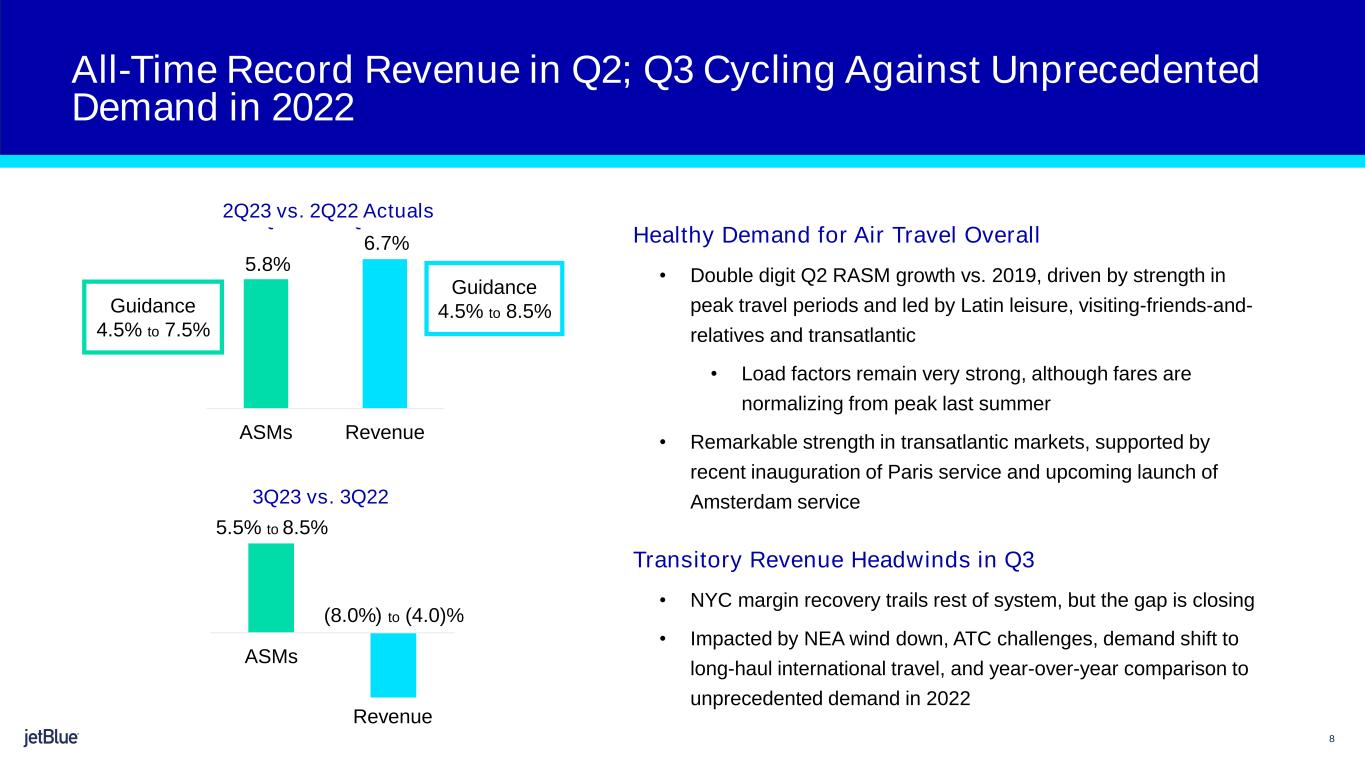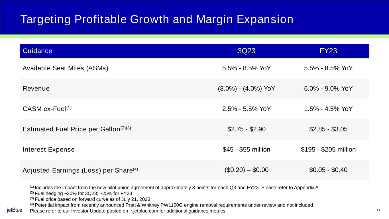 1 2 (1) Includes the impact from the new pilot union agreement of approximately 3 points for each Q3 and FY23. Please refer to Appendix A (2) Fuel hedging ~30% for 3Q23; ~25% for FY23 (3) Fuel price based on forward curve as of July 21, 2023 (4) Potential impact from recently announced Pratt & Whitney PW1100G engine removal requirements under review and not included Please refer to our Investor Update posted on ir.jetblue.com for additional guidance metrics Guidance 3Q23 FY23 Available Seat Miles (ASMs) 5.5% - 8.5% YoY 5.5% - 8.5% YoY Revenue (8.0%) - (4.0%) YoY 6.0% - 9.0% YoY CASM ex-Fuel(1) 2.5% - 5.5% YoY 1.5% - 4.5% YoY Estimated Fuel Price per Gallon(2)(3) $2.75 - $2.90 $2.85 - $3.05 Interest Expense $45 - $55 million $195 - $205 million Adjusted Earnings (Loss) per Share(4) ($0.20) – $0.00 $0.05 - $0.40 Targeting Profitable Growth and Margin Expansion