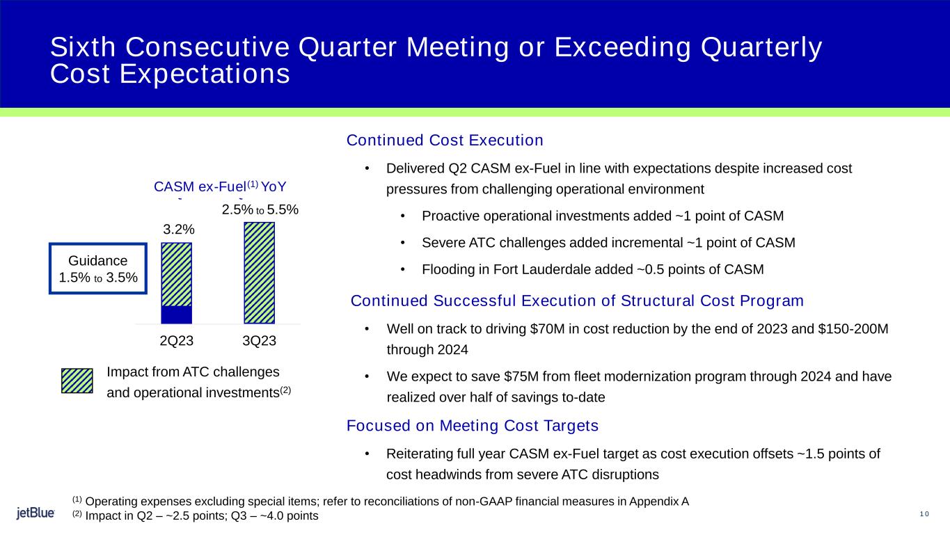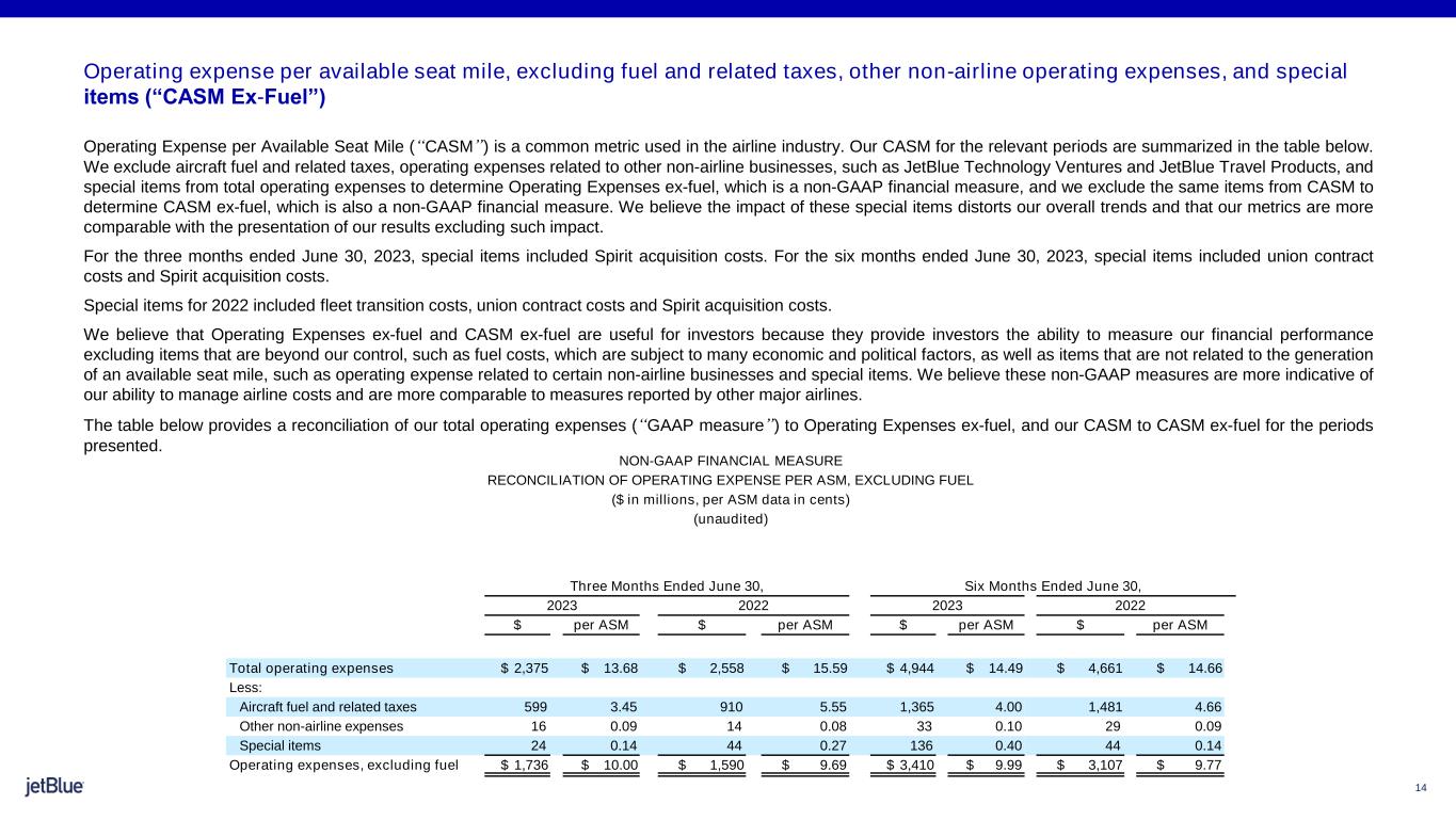 14 Operating expense per available seat mile, excluding fuel and related taxes, other non-airline operating expenses, and special items (“CASM Ex-Fuel”) Operating Expense per Available Seat Mile (“CASM”) is a common metric used in the airline industry. Our CASM for the relevant periods are summarized in the table below. We exclude aircraft fuel and related taxes, operating expenses related to other non-airline businesses, such as JetBlue Technology Ventures and JetBlue Travel Products, and special items from total operating expenses to determine Operating Expenses ex-fuel, which is a non-GAAP financial measure, and we exclude the same items from CASM to determine CASM ex-fuel, which is also a non-GAAP financial measure. We believe the impact of these special items distorts our overall trends and that our metrics are more comparable with the presentation of our results excluding such impact. For the three months ended June 30, 2023, special items included Spirit acquisition costs. For the six months ended June 30, 2023, special items included union contract costs and Spirit acquisition costs. Special items for 2022 included fleet transition costs, union contract costs and Spirit acquisition costs. We believe that Operating Expenses ex-fuel and CASM ex-fuel are useful for investors because they provide investors the ability to measure our financial performance excluding items that are beyond our control, such as fuel costs, which are subject to many economic and political factors, as well as items that are not related to the generation of an available seat mile, such as operating expense related to certain non-airline businesses and special items. We believe these non-GAAP measures are more indicative of our ability to manage airline costs and are more comparable to measures reported by other major airlines. The table below provides a reconciliation of our total operating expenses (“GAAP measure”) to Operating Expenses ex-fuel, and our CASM to CASM ex-fuel for the periods presented. NON-GAAP FINANCIAL MEASURE RECONCILIATION OF OPERATING EXPENSE PER ASM, EXCLUDING FUEL ($ in millions, per ASM data in cents) (unaudited) Three Months Ended June 30, Six Months Ended June 30, 2023 2022 2023 2022 $ per ASM $ per ASM $ per ASM $ per ASM Total operating expenses $ 2,375 $ 13.68 $ 2,558 $ 15.59 $ 4,944 $ 14.49 $ 4,661 $ 14.66 Less: Aircraft fuel and related taxes 599 3.45 910 5.55 1,365 4.00 1,481 4.66 Other non-airline expenses 16 0.09 14 0.08 33 0.10 29 0.09 Special items 24 0.14 44 0.27 136 0.40 44 0.14 Operating expenses, excluding fuel $ 1,736 $ 10.00 $ 1,590 $ 9.69 $ 3,410 $ 9.99 $ 3,107 $ 9.77
