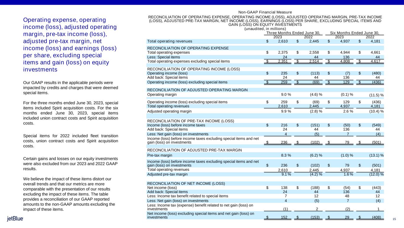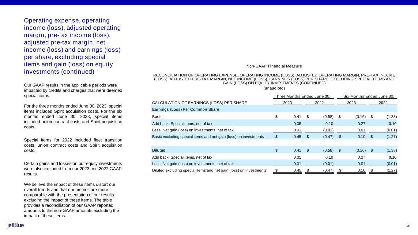 15 Operating expense, operating income (loss), adjusted operating margin, pre-tax income (loss), adjusted pre-tax margin, net income (loss) and earnings (loss) per share, excluding special items and gain (loss) on equity investments Our GAAP results in the applicable periods were impacted by credits and charges that were deemed special items. For the three months ended June 30, 2023, special items included Spirit acquisition costs. For the six months ended June 30, 2023, special items included union contract costs and Spirit acquisition costs. Special items for 2022 included fleet transition costs, union contract costs and Spirit acquisition costs. Certain gains and losses on our equity investments were also excluded from our 2023 and 2022 GAAP results. We believe the impact of these items distort our overall trends and that our metrics are more comparable with the presentation of our results excluding the impact of these items. The table provides a reconciliation of our GAAP reported amounts to the non-GAAP amounts excluding the impact of these items. Non-GAAP Financial Measure RECONCILIATION OF OPERATING EXPENSE, OPERATING INCOME (LOSS), ADJUSTED OPERATING MARGIN, PRE-TAX INCOME (LOSS), ADJUSTED PRE-TAX MARGIN, NET INCOME (LOSS), EARNINGS (LOSS) PER SHARE, EXCLUDING SPECIAL ITEMS AND GAIN (LOSS) ON EQUITY INVESTMENTS (unaudited, in millions) Three Months Ended June 30, Six Months Ended June 30, 2023 2022 2023 2022 Total operating revenues $ 2,610 $ 2,445 $ 4,937 $ 4,181 RECONCILIATION OF OPERATING EXPENSE Total operating expenses $ 2,375 $ 2,558 $ 4,944 $ 4,661 Less: Special items 24 44 136 44 Total operating expenses excluding special items $ 2,351 $ 2,514 $ 4,808 $ 4,617 RECONCILIATION OF OPERATING INCOME (LOSS) Operating income (loss) $ 235 $ (113) $ (7) $ (480) Add back: Special items 24 44 136 44 Operating income (loss) excluding special items $ 259 $ (69) $ 129 $ (436) RECONCILIATION OF ADJUSTED OPERATING MARGIN Operating margin 9.0 % (4.6) % (0.1) % (11.5) % Operating income (loss) excluding special items $ 259 $ (69) $ 129 $ (436) Total operating revenues 2,610 2,445 4,937 4,181 Adjusted operating margin 9.9 % (2.8) % 2.6 % (10.4) % RECONCILIATION OF PRE-TAX INCOME (LOSS) Income (loss) before income taxes $ 216 $ (151) $ (50) $ (549) Add back: Special items 24 44 136 44 Less: Net gain (loss) on investments 4 (5) 7 (4) Income (loss) before income taxes excluding special items and net gain (loss) on investments $ 236 $ (102) $ 79 $ (501) RECONCILIATION OF ADJUSTED PRE-TAX MARGIN Pre-tax margin 8.3 % (6.2) % (1.0) % (13.1) % Income (loss) before income taxes excluding special items and net gain (loss) on investments $ 236 $ (102) $ 79 $ (501) Total operating revenues 2,610 2,445 4,937 4,181 Adjusted pre-tax margin 9.1 % (4.2) % 1.6 % (12.0) % RECONCILIATION OF NET INCOME (LOSS) Net income (loss) $ 138 $ (188) $ (54) $ (443) Add back: Special items 24 44 136 44 Less: Income tax benefit related to special items 7 12 48 12 Less: Net gain (loss) on investments 4 (5) 7 (4) Less: Income tax (expense) benefit related to net gain (loss) on investments (1) 2 (2) 1 Net income (loss) excluding special items and net gain (loss) on investments $ 152 $ (153) $ 29 $ (408)