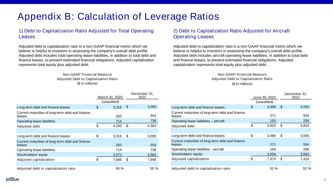 17 LOCATION 1) Debt to Capitalization Ratio Adjusted for Total Operating Leases Adjusted debt to capitalization ratio is a non-GAAP financial metric which we believe is helpful to investors in assessing the company's overall debt profile. Adjusted debt includes total operating lease liabilities, in addition to total debt and finance leases, to present estimated financial obligations. Adjusted capitalization represents total equity plus adjusted debt. Appendix B: Calculation of Leverage Ratios Non-GAAP Financial Measure Adjusted Debt to Capitalization Ratio ($ in millions) March 31, 2023 December 31, 2022 (unaudited) Long-term debt and finance leases $ 3,316 $ 3,093 Current maturities of long-term debt and finance leases 263 554 Operating lease liabilities 714 736 Adjusted debt $ 4,293 $ 4,383 Long-term debt and finance leases $ 3,316 $ 3,093 Current maturities of long-term debt and finance leases 263 554 Operating lease liabilities 714 736 Stockholders' equity 3,373 3,563 Adjusted capitalization $ 7,666 $ 7,946 Adjusted debt to capitalization ratio 56 % 55 % Non-GAAP Financial Measure Adjusted Debt to Capitalization Ratio ($ in millions) June 30, 2023 December 31, 2022 (unaudited) Long-term debt and finance leases $ 3,486 $ 3,093 Current maturities of long-term debt and finance leases 271 554 Operating lease liabilities – aircraft 163 206 Adjusted debt $ 3,920 $ 3,853 Long-term debt and finance leases $ 3,486 $ 3,093 Current maturities of long-term debt and finance leases 271 554 Operating lease liabilities - aircraft 163 206 Stockholders' equity 3,554 3,563 Adjusted capitalization $ 7,474 $ 7,416 Adjusted debt to capitalization ratio 52 % 52 % 2) Debt to Capitalization Ratio Adjusted for Aircraft Operating Leases Adjusted debt to capitalization ratio is a non-GAAP financial metric which we believe is helpful to investors in assessing the company's overall debt profile. Adjusted debt includes aircraft operating lease liabilities, in addition to total debt and finance leases, to present estimated financial obligations. Adjusted capitalization represents total equity plus adjusted debt.