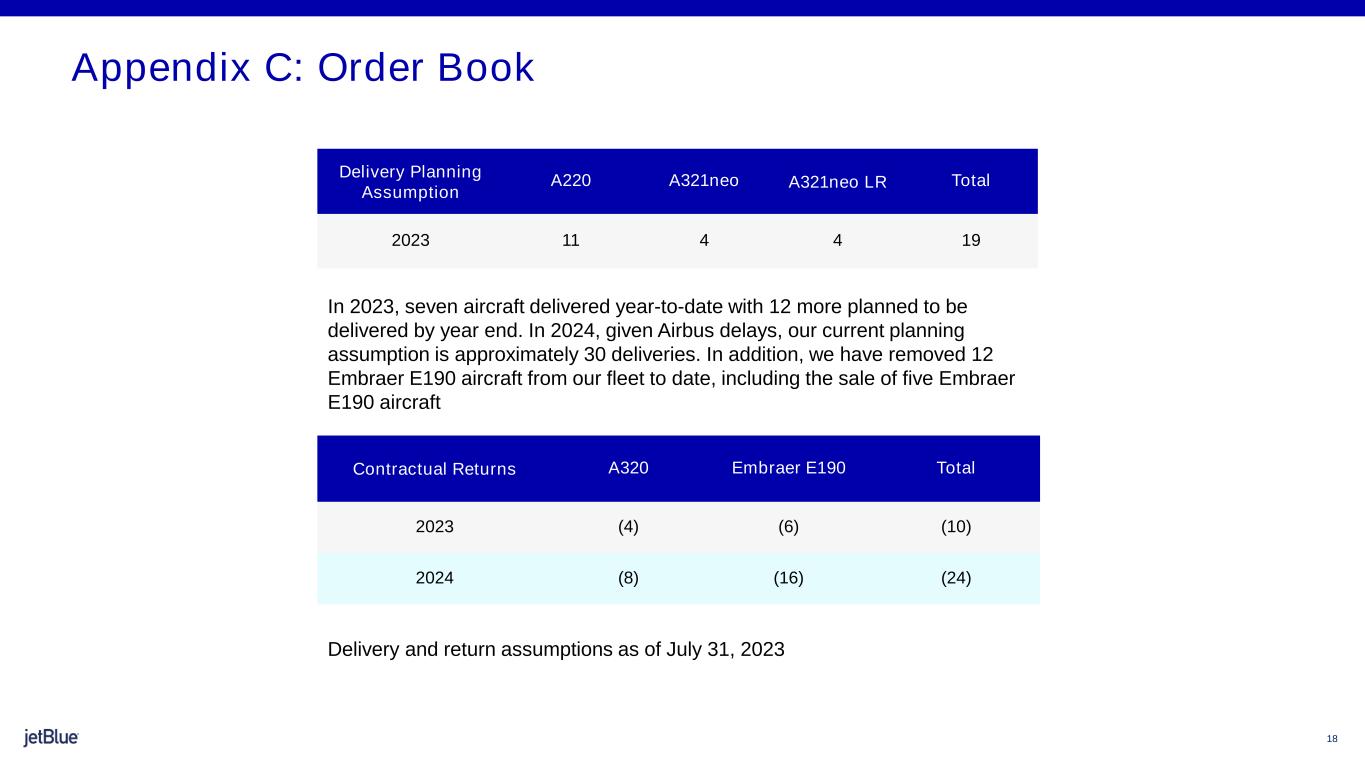 18 Delivery Planning Assumption A220 A321neo A321neo LR Total 2023 11 4 4 19 Delivery and return assumptions as of July 31, 2023 In 2023, seven aircraft delivered year-to-date with 12 more planned to be delivered by year end. In 2024, given Airbus delays, our current planning assumption is approximately 30 deliveries. In addition, we have removed 12 Embraer E190 aircraft from our fleet to date, including the sale of five Embraer E190 aircraft Appendix C: Order Book Contractual Returns A320 Embraer E190 Total 2023 (4) (6) (10) 2024 (8) (16) (24)