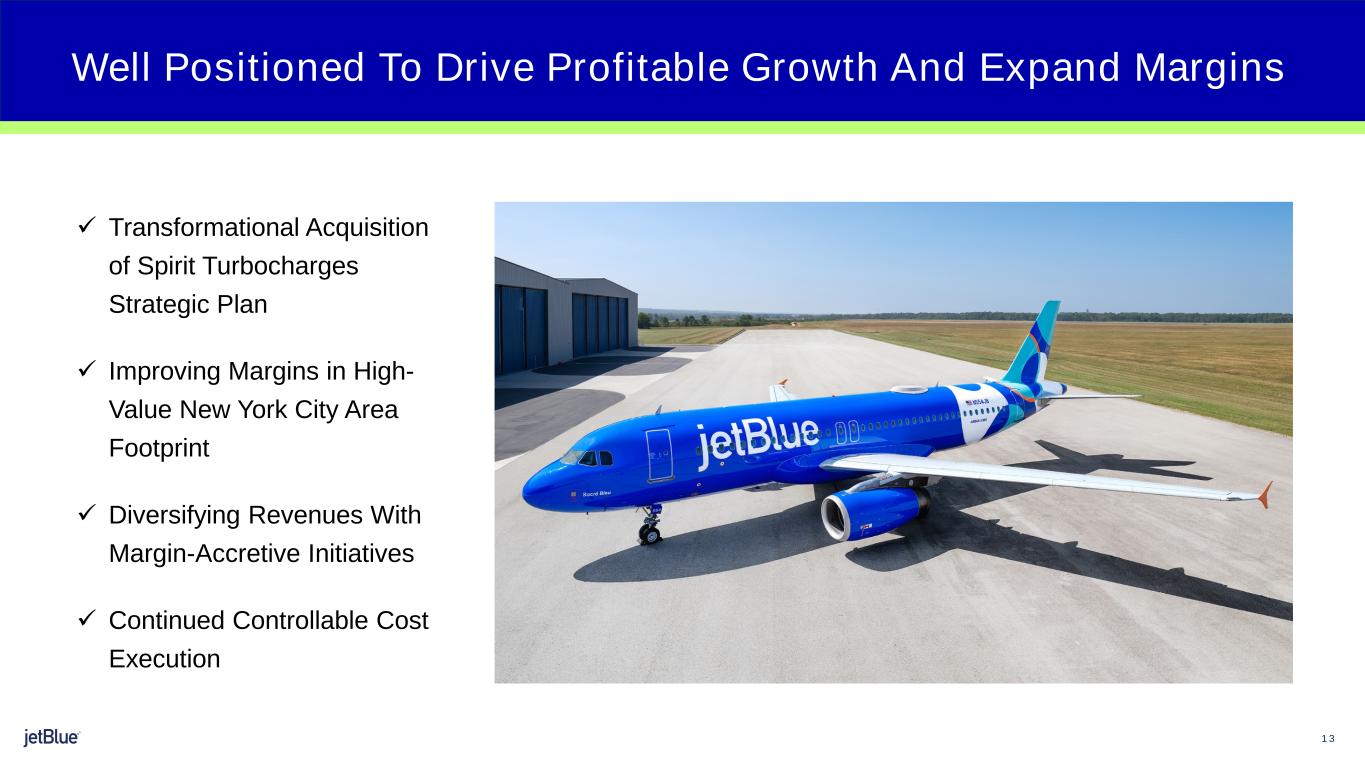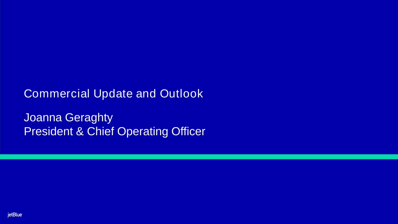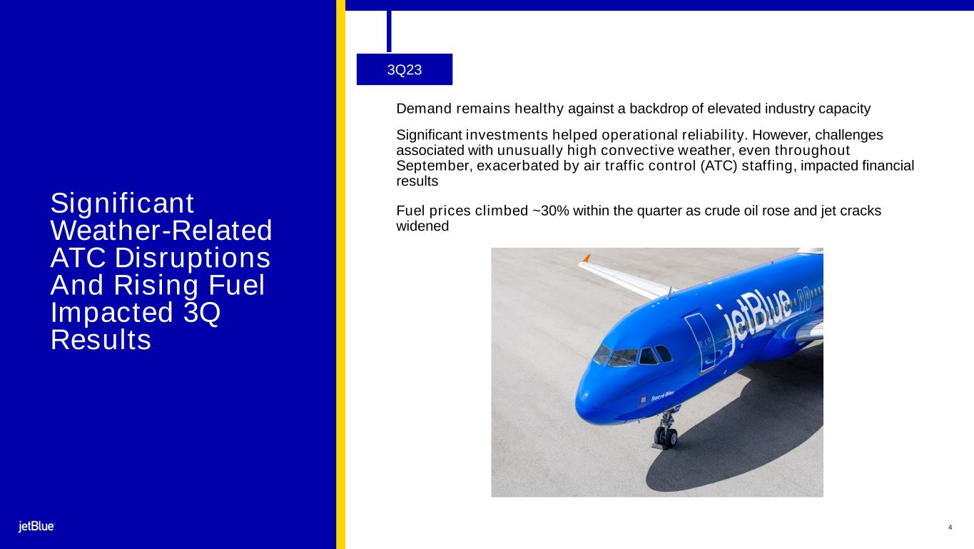 2 The image part with relationship ID rId26 was not found in the file. Safe Harbor This Presentation contains forward-looking statements within the meaning of the Private Securities Litigation Reform Act of 1995, as amended. We intend such forward-looking statements to be covered by the safe harbor provisions for forward-looking statements contained in Section 27A of the Securities Act of 1933, as amended, and Section 21E of the Securities Exchange Act of 1934, as amended. All statements other than statements of historical facts contained in this Presentation may be forward-looking statements. In some cases, you can identify forward-looking statements by terms such as “expects,” “plans,” “intends,” “anticipates,” “indicates,” “remains,” “believes,” “estimates,” “forecast,” “guidance,” “outlook,” “may,” “will,” “should,” “seeks,” “goals,” “targets” or the negative of these terms or other similar expressions. Additionally, forward-looking statements include statements that do not relate solely to historical facts, such as statements which identify uncertainties or trends, discuss the possible future effects of current known trends or uncertainties, or which indicate that the future effects of known trends or uncertainties cannot be predicted, guaranteed, or assured. Forward-looking statements contained in this Presentation include, without limitation, statements regarding our outlook and future results of operations and financial position, expectations with respect to headwinds, including the continued wind down of the Northeast Alliance, the impact of ATC- and weather-driven delays, shifts in post-COVID customer demand, and fluctuations in fuel prices, and strategies to mitigate the associated impact, industry and market trends, our business strategy and plans for future operations, including our planned merger with Spirit (the “Merger”), our Structural Cost Program, and planned operational investments, and the associated impacts on our business. Forward-looking statements involve risks, uncertainties and assumptions, and are based on information currently available to us. Actual results may differ materially from those expressed in the forward-looking statements due to many factors, including, without limitation, the COVID-19 pandemic and government-imposed measures to control its spread; risk associated with execution of our strategic operating plans in the near-term and long- term; our extremely competitive industry; risks related to the long-term nature of our fleet order book; volatility in fuel prices and availability of fuel; increased maintenance costs associated with fleet age; costs associated with salaries, wages and benefits; risks associated with doing business internationally; our reliance on high daily aircraft utilization; our dependence on the New York metropolitan market; risks associated with extended interruptions or disruptions in service at our focus cities; risks associated with airport expenses; risks associated with seasonality and weather; our reliance on a limited number of suppliers; risks related to new or increased tariffs imposed on commercial aircraft and related parts imported from outside the United States; the outcome of legal proceedings with respect to our Northeast Alliance with American Airlines Group Inc. and our planned wind-down of the Northeast Alliance; the occurrence of any event, change or other circumstances that could give rise to the right of JetBlue or Spirit Airlines Inc. (“Spirit”) or both of them to terminate the Merger Agreement; failure to obtain certain governmental approvals necessary to consummate the merger with Spirit (the “Merger”); the outcome of the lawsuit filed by the Department of Justice and certain state Attorneys General against us and Spirit related to the Merger; risks associated with failure to consummate the Merger in a timely manner or at all; risks associated with the pendency of the Merger and related business disruptions; indebtedness following consummation of the Merger and associated impacts on business flexibility, borrowing costs and credit ratings; the possibility that JetBlue may be unable to achieve expected synergies and operating efficiencies within the expected timeframes or at all; challenges associated with successful integration of Spirit's operations; expenses related to the Merger and integration of Spirit; the potential for loss of management personnel and other key crewmembers as a result of the Merger; risks associated with effective management of the combined company following the Merger; risks associated with JetBlue being bound by all obligations and liabilities of the combined company following consummation of the Merger; risks associated with the integration of JetBlue and Spirit workforces, including with respect to negotiation of labor agreements and labor costs; the impact of the Merger on JetBlue’s earnings per share; risks associated with cybersecurity and privacy, including information security breaches; heightened regulatory requirements concerning data security compliance; risks associated with reliance on, and potential failure of, automated systems to operate our business; our inability to attract and retain qualified crewmembers; our being subject to potential unionization, work stoppages, slowdowns or increased labor costs; reputational and business risk from an accident or incident involving our aircraft; risks associated with damage to our reputation and the JetBlue brand name; our significant amount of fixed obligations and the ability to service such obligations; our substantial indebtedness and impact on our ability to meet future financing needs; financial risks associated with credit card processors; restrictions as a result of our participation in governmental support programs under the CARES Act, the Consolidated Appropriations Act, and the American Rescue Plan Act; risks associated with s