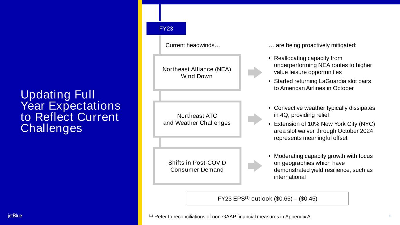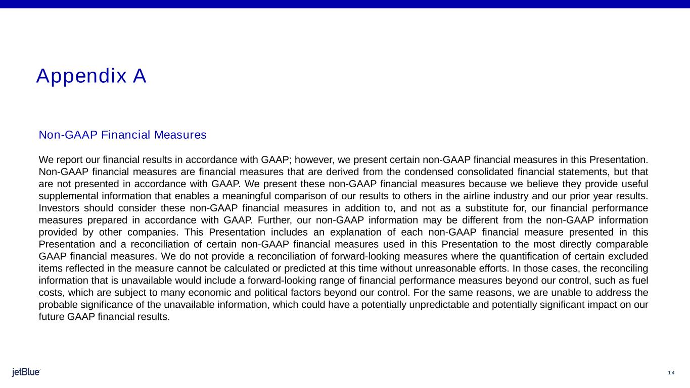 1 4 The image part with relationship ID rId26 was not found in the file. Non-GAAP Financial Measures We report our financial results in accordance with GAAP; however, we present certain non-GAAP financial measures in this Presentation. Non-GAAP financial measures are financial measures that are derived from the condensed consolidated financial statements, but that are not presented in accordance with GAAP. We present these non-GAAP financial measures because we believe they provide useful supplemental information that enables a meaningful comparison of our results to others in the airline industry and our prior year results. Investors should consider these non-GAAP financial measures in addition to, and not as a substitute for, our financial performance measures prepared in accordance with GAAP. Further, our non-GAAP information may be different from the non-GAAP information provided by other companies. This Presentation includes an explanation of each non-GAAP financial measure presented in this Presentation and a reconciliation of certain non-GAAP financial measures used in this Presentation to the most directly comparable GAAP financial measures. We do not provide a reconciliation of forward-looking measures where the quantification of certain excluded items reflected in the measure cannot be calculated or predicted at this time without unreasonable efforts. In those cases, the reconciling information that is unavailable would include a forward-looking range of financial performance measures beyond our control, such as fuel costs, which are subject to many economic and political factors beyond our control. For the same reasons, we are unable to address the probable significance of the unavailable information, which could have a potentially unpredictable and potentially significant impact on our future GAAP financial results. Appendix A