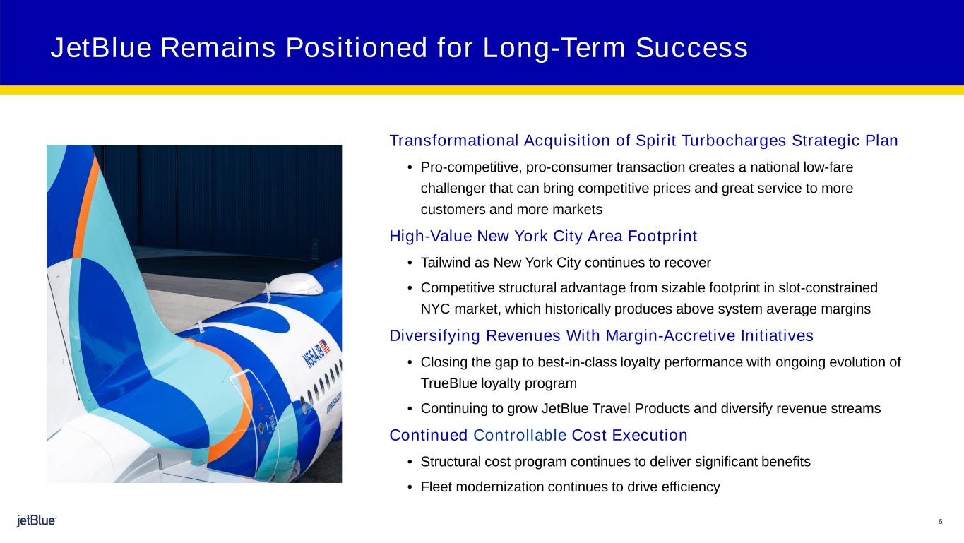 5 The image part with relationship ID rId26 was not found in the file. • Reallocating capacity from underperforming NEA routes to higher value leisure opportunities • Started returning LaGuardia slot pairs to American Airlines in October Current headwinds… FY23 Updating Full Year Expectations to Reflect Current Challenges FY23 EPS(1) outlook ($0.65) – ($0.45) Northeast Alliance (NEA) Wind Down • Convective weather typically dissipates in 4Q, providing relief • Extension of 10% New York City (NYC) area slot waiver through October 2024 represents meaningful offset • Moderating capacity growth with focus on geographies which have demonstrated yield resilience, such as international … are being proactively mitigated: Shifts in Post-COVID Consumer Demand Northeast ATC and Weather Challenges (1) Refer to reconciliations of non-GAAP financial measures in Appendix A
