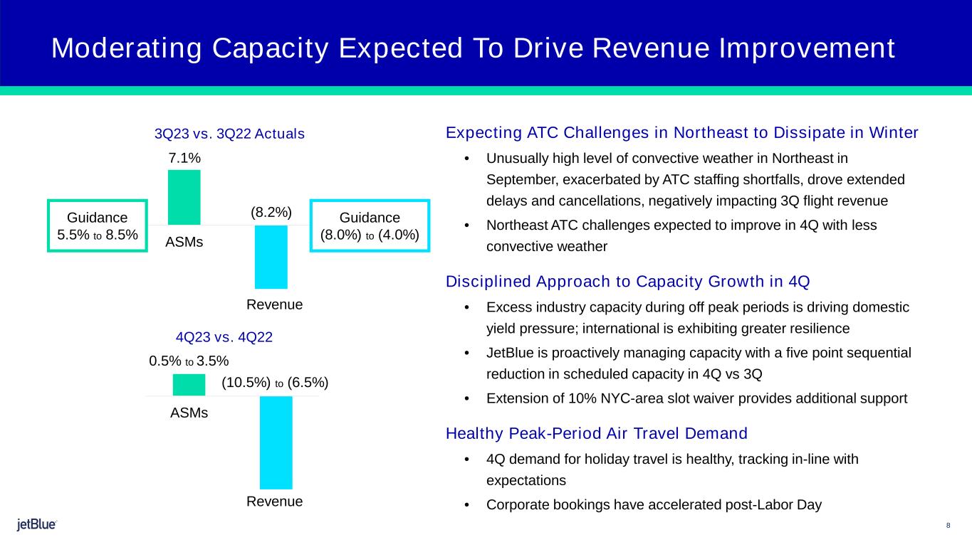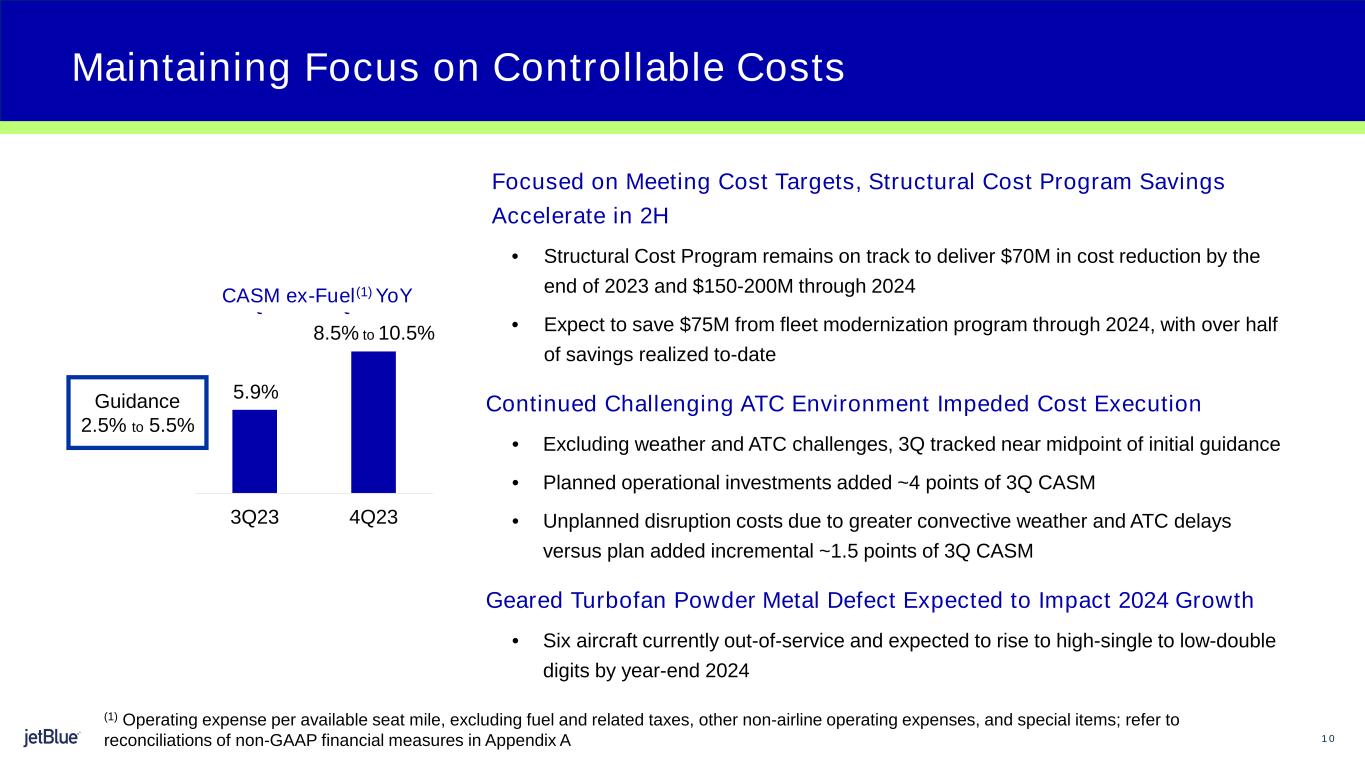 1 2 The image part with relationship ID rId26 was not found in the file. (1) Includes the impact from the new pilot union agreement of approximately 4 points for Q4 and 3 points for FY23. Please refer to Appendix A (2) Fuel hedged ~30% for 4Q23; ~25% for FY23 (3) Fuel price based on forward curve as of October 20, 2023 Please refer to our Investor Update posted on ir.jetblue.com for additional guidance metrics Guidance 4Q23 FY23 Available Seat Miles (ASMs) 0.5% - 3.5% YoY 5.0% - 7.0% YoY Revenue (10.5%) - (6.5%) YoY 3.0% - 5.0% YoY CASM ex-Fuel(1) 8.5% - 10.5% YoY 4.5% - 5.5% YoY Estimated Fuel Price per Gallon(2)(3) $3.05 - $3.20 $3.02 - $3.07 Interest Expense $60 - $70 million $205 - $215 million Adjusted Loss per Share (Non-GAAP) ($0.55) – ($0.35) ($0.65) – ($0.45) Outlook Summary