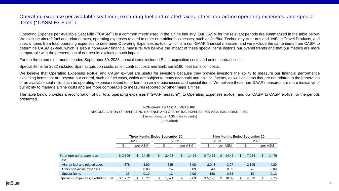 1 5 The image part with relationship ID rId26 was not found in the file. Operating expense per available seat mile, excluding fuel and related taxes, other non-airline operating expenses, and special items (“CASM Ex-Fuel”) Operating Expense per Available Seat Mile (“CASM”) is a common metric used in the airline industry. Our CASM for the relevant periods are summarized in the table below. We exclude aircraft fuel and related taxes, operating expenses related to other non-airline businesses, such as JetBlue Technology Ventures and JetBlue Travel Products, and special items from total operating expenses to determine Operating Expenses ex-fuel, which is a non-GAAP financial measure, and we exclude the same items from CASM to determine CASM ex-fuel, which is also a non-GAAP financial measure. We believe the impact of these special items distorts our overall trends and that our metrics are more comparable with the presentation of our results excluding such impact. For the three and nine months ended September 30, 2023, special items included Spirit acquisition costs and union contract costs. Special items for 2022 included Spirit acquisition costs, union contract costs and Embraer E190 fleet transition costs. We believe that Operating Expenses ex-fuel and CASM ex-fuel are useful for investors because they provide investors the ability to measure our financial performance excluding items that are beyond our control, such as fuel costs, which are subject to many economic and political factors, as well as items that are not related to the generation of an available seat mile, such as operating expense related to certain non-airline businesses and special items. We believe these non-GAAP measures are more indicative of our ability to manage airline costs and are more comparable to measures reported by other major airlines. The table below provides a reconciliation of our total operating expenses (“GAAP measure”) to Operating Expenses ex-fuel, and our CASM to CASM ex-fuel for the periods presented. NON-GAAP FINANCIAL MEASURE RECONCILIATION OF OPERATING EXPENSE AND OPERATING EXPENSE PER ASM, EXCLUDING FUEL ($ in millions, per ASM data in cents) (unaudited) Three Months Ended September 30, Nine Months Ended September 30, 2023 2022 2023 2022 $ per ASM $ per ASM $ per ASM $ per ASM Total operating expenses $ 2,509 $ 14.45 $ 2,423 $ 14.94 $ 7,453 $ 14.48 $ 7,084 $ 14.76 Less: Aircraft fuel and related taxes 678 3.90 825 5.08 2,043 3.97 2,305 4.80 Other non-airline expenses 16 0.09 14 0.09 49 0.09 43 0.09 Special items 33 0.19 13 0.08 168 0.33 57 0.12 Operating expenses, excluding fuel $ 1,782 $ 10.27 $ 1,571 $ 9.69 $ 5,193 $ 10.09 $ 4,679 $ 9.75