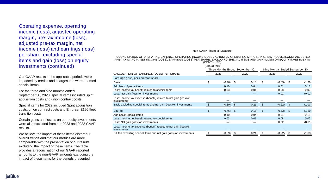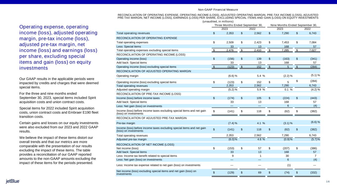 1 6 The image part with relationship ID rId26 was not found in the file. Non-GAAP Financial Measure RECONCILIATION OF OPERATING EXPENSE, OPERATING INCOME (LOSS), ADJUSTED OPERATING MARGIN, PRE-TAX INCOME (LOSS), ADJUSTED PRE-TAX MARGIN, NET INCOME (LOSS), EARNINGS (LOSS) PER SHARE, EXCLUDING SPECIAL ITEMS AND GAIN (LOSS) ON EQUITY INVESTMENTS (unaudited, in millions) Three Months Ended September 30, Nine Months Ended September 30, 2023 2022 2023 2022 Total operating revenues $ 2,353 $ 2,562 $ 7,290 $ 6,743 RECONCILIATION OF OPERATING EXPENSE Total operating expenses $ 2,509 $ 2,423 $ 7,453 $ 7,084 Less: Special items 33 13 168 57 Total operating expenses excluding special items $ 2,476 $ 2,410 $ 7,285 $ 7,027 RECONCILIATION OF OPERATING INCOME (LOSS) Operating income (loss) $ (156) $ 139 $ (163) $ (341) Add back: Special items 33 13 168 57 Operating income (loss) excluding special items $ (123) $ 152 $ 5 $ (284) RECONCILIATION OF ADJUSTED OPERATING MARGIN Operating margin (6.6) % 5.4 % (2.2) % (5.1) % Operating income (loss) excluding special items $ (123) $ 152 $ 5 $ (284) Total operating revenues 2,353 2,562 7,290 6,743 Adjusted operating margin (5.2) % 5.9 % 0.1 % (4.2) % RECONCILIATION OF PRE-TAX INCOME (LOSS) Income (loss) before income taxes $ (174) $ 105 $ (224) $ (443) Add back: Special items 33 13 168 57 Less: Net gain (loss) on investments — — 6 (4) Income (loss) before income taxes excluding special items and net gain (loss) on investments $ (141) $ 118 $ (62) $ (382) RECONCILIATION OF ADJUSTED PRE-TAX MARGIN Pre-tax margin (7.4) % 4.1 % (3.1) % (6.6) % Income (loss) before income taxes excluding special items and net gain (loss) on investments $ (141) $ 118 $ (62) $ (382) Total operating revenues 2,353 2,562 7,290 6,743 Adjusted pre-tax margin (6.0)% 4.6 % (0.9)% (5.7)% RECONCILIATION OF NET INCOME (LOSS) Net income (loss) $ (153) $ 57 $ (207) $ (386) Add back: Special items 33 13 168 57 Less: Income tax benefit related to special items 9 1 30 7 Less: Net gain (loss) on investments — — 6 (4) Less: Income tax expense related to net gain (loss) on investments — — (1) — Net income (loss) excluding special items and net gain (loss) on investments $ (129) $ 69 $ (74) $ (332) Operating expense, operating income (loss), adjusted operating margin, pre-tax income (loss), adjusted pre-tax margin, net income (loss) and earnings (loss) per share, excluding special items and gain (loss) on equity investments Our GAAP results in the applicable periods were impacted by credits and charges that were deemed special items. For the three and nine months ended September 30, 2023, special items included Spirit acquisition costs and union contract costs. Special items for 2022 included Spirit acquisition costs, union contract costs and Embraer E190 fleet transition costs. Certain gains and losses on our equity investments were also excluded from our 2023 and 2022 GAAP results. We believe the impact of these items distort our overall trends and that our metrics are more comparable with the presentation of our results excluding the impact of these items. The table provides a reconciliation of our GAAP reported amounts to the non-GAAP amounts excluding the impact of these items for the periods presented.