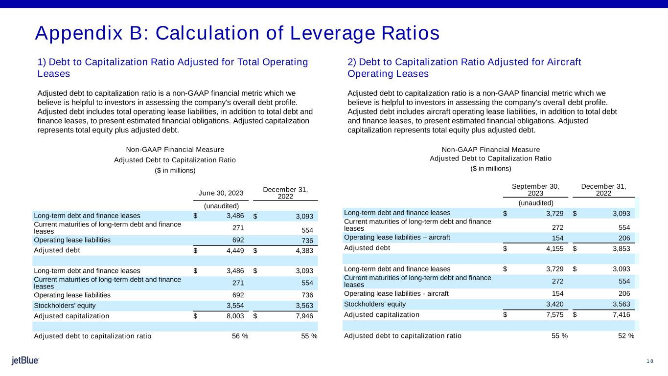 1 8 The image part with relationship ID rId26 was not found in the file. LOCATION 1) Debt to Capitalization Ratio Adjusted for Total Operating Leases Adjusted debt to capitalization ratio is a non-GAAP financial metric which we believe is helpful to investors in assessing the company's overall debt profile. Adjusted debt includes total operating lease liabilities, in addition to total debt and finance leases, to present estimated financial obligations. Adjusted capitalization represents total equity plus adjusted debt. Appendix B: Calculation of Leverage Ratios Non-GAAP Financial Measure Adjusted Debt to Capitalization Ratio ($ in millions) June 30, 2023 December 31, 2022 (unaudited) Long-term debt and finance leases $ 3,486 $ 3,093 Current maturities of long-term debt and finance leases 271 554 Operating lease liabilities 692 736 Adjusted debt $ 4,449 $ 4,383 Long-term debt and finance leases $ 3,486 $ 3,093 Current maturities of long-term debt and finance leases 271 554 Operating lease liabilities 692 736 Stockholders' equity 3,554 3,563 Adjusted capitalization $ 8,003 $ 7,946 Adjusted debt to capitalization ratio 56 % 55 % Non-GAAP Financial Measure Adjusted Debt to Capitalization Ratio ($ in millions) September 30, 2023 December 31, 2022 (unaudited) Long-term debt and finance leases $ 3,729 $ 3,093 Current maturities of long-term debt and finance leases 272 554 Operating lease liabilities – aircraft 154 206 Adjusted debt $ 4,155 $ 3,853 Long-term debt and finance leases $ 3,729 $ 3,093 Current maturities of long-term debt and finance leases 272 554 Operating lease liabilities - aircraft 154 206 Stockholders' equity 3,420 3,563 Adjusted capitalization $ 7,575 $ 7,416 Adjusted debt to capitalization ratio 55 % 52 % 2) Debt to Capitalization Ratio Adjusted for Aircraft Operating Leases Adjusted debt to capitalization ratio is a non-GAAP financial metric which we believe is helpful to investors in assessing the company's overall debt profile. Adjusted debt includes aircraft operating lease liabilities, in addition to total debt and finance leases, to present estimated financial obligations. Adjusted capitalization represents total equity plus adjusted debt.