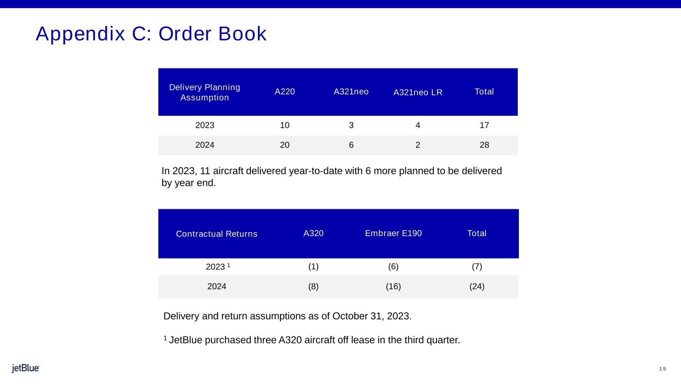 1 9 The image part with relationship ID rId26 was not found in the file. Delivery Planning Assumption A220 A321neo A321neo LR Total 2023 10 3 4 17 2024 20 6 2 28 Delivery and return assumptions as of October 31, 2023. 1 JetBlue purchased three A320 aircraft off lease in the third quarter. In 2023, 11 aircraft delivered year-to-date with 6 more planned to be delivered by year end. Appendix C: Order Book Contractual Returns A320 Embraer E190 Total 2023 1 (1) (6) (7) 2024 (8) (16) (24)