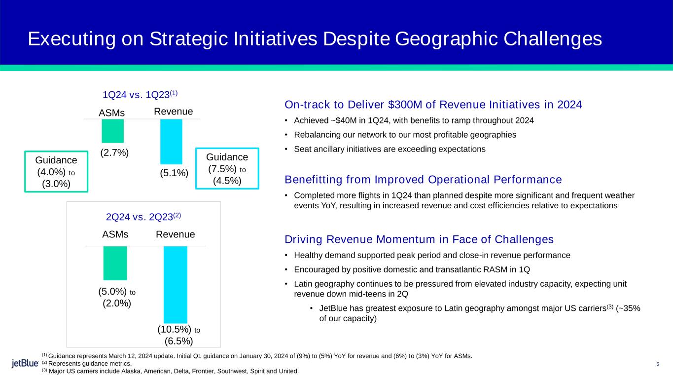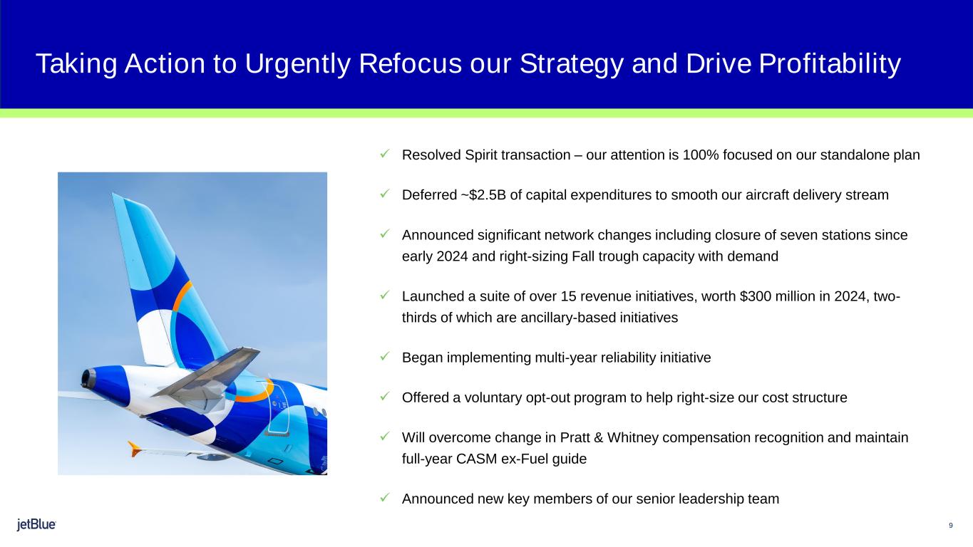 1 Safe Harbor This Presentation contains forward-looking statements within the meaning of the Private Securities Litigation Reform Act of 1995, as amended. We intend such forward-looking statements to be covered by the safe harbor provisions for forward-looking statements contained in Section 27A of the Securities Act of 1933, as amended, and Section 21E of the Securities Exchange Act of 1934, as amended. All statements other than statements of historical facts contained in this Presentation are forward-looking statements. In some cases, you can identify forward-looking statements by terms such as “expects,” “plans,” “intends,” “anticipates,” “indicates,” “remains,” “believes,” “estimates,” “forecast,” “guidance,” “outlook,” “may,” “will,” “should,” “seeks,” “goals,” “targets” or the negative of these terms or other similar expressions. Additionally, forward-looking statements include statements that do not relate solely to historical facts, such as statements which identify uncertainties or trends, discuss the possible future effects of current known trends or uncertainties, or which indicate that the future effects of known trends or uncertainties cannot be predicted, guaranteed, or assured. Forward-looking statements contained in this Presentation include, without limitation, statements regarding our outlook and future results of operations and financial position, our order book and return schedule, our business strategy and plans for future operations, and the associated impacts on our business. Forward-looking statements involve risks, uncertainties and assumptions, and are based on information currently available to us. Actual results may differ materially from those expressed in the forward-looking statements due to many factors, including, without limitation, the risk associated with the execution of our strategic operating plans in the near-term and long-term; our extremely competitive industry; risks related to the long-term nature of our fleet order book; volatility in fuel prices and availability of fuel; increased maintenance costs associated with fleet age; costs associated with salaries, wages and benefits; risks associated with a potential material reduction in the rate of interchange reimbursement fees; risks associated with doing business internationally; our reliance on high daily aircraft utilization; our dependence on the New York metropolitan market; risks associated with extended interruptions or disruptions in service at our focus cities; risks associated with airport expenses; risks associated with seasonality and weather; our reliance on a limited number of suppliers for our aircraft, engines, and our Fly-Fi® product; risks related to new or increased tariffs imposed on commercial aircraft and related parts imported from outside the United States; the outcome of legal proceedings with respect to the NEA and our wind-down of the NEA; risks associated with cybersecurity and privacy, including information security breaches; heightened regulatory requirements concerning data security compliance; risks associated with reliance on, and potential failure of, automated systems to operate our business; our inability to attract and retain qualified crewmembers; our being subject to potential unionization, work stoppages, slowdowns or increased labor costs; reputational and business risk from an accident or incident involving our aircraft; risks associated with damage to our reputation and the JetBlue brand name; our significant amount of fixed obligations and the ability to service such obligations; our substantial indebtedness and impact on our ability to meet future financing needs; financial risks associated with credit card processors; risks associated with seeking short-term additional financing liquidity; failure to realize the full value of intangible or long-lived assets, causing us to record impairments; risks associated with disease outbreaks or environmental disasters affecting travel behavior; compliance with environmental laws and regulations, which may cause us to incur substantial costs; the impacts of federal budget constraints or federally imposed furloughs; impact of global climate change and legal, regulatory or market response to such change; increasing attention to, and evolving expectations regarding, environmental, social and governance matters; changes in government regulations in our industry; acts of war or terrorism; and changes in global economic conditions or an economic downturn leading to a continuing or accelerated decrease in demand for air travel. It is routine for our internal projections and expectations to change as the year or each quarter in the year progresses, and therefore it should be clearly understood that the internal projections, beliefs, and assumptions upon which we base our expectations may change prior to the end of each quarter or year. Given the risks and uncertainties surrounding forward-looking statements, you should not place undue reliance on these statements. You should understand that many important factors, in addition to those discussed or incorporated by reference in this Presentation, could cause our results to differ materially from those expressed in the forward-looking statements. Further information concerning these and other factors is contained in JetBlue's filings with the U.S. Securities and Exchange Commission (the “SEC”), including but not limited to in our Annual Report on Form 10-K for the year ended December 31, 2023, as may be updated by our other SEC filings. In light of these risks and uncertainties, the forward-looking events discussed in this presentation might not occur. Our forward-looking statements speak only as of the date of this Presentation. Other than as required by law, we undertake no obligation to update or revise forward-looking statements, whether as a result of new information, future events, or otherwise.