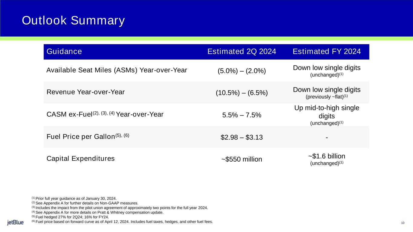 9  Resolved Spirit transaction – our attention is 100% focused on our standalone plan  Deferred ~$2.5B of capital expenditures to smooth our aircraft delivery stream  Announced significant network changes including closure of seven stations since early 2024 and right-sizing Fall trough capacity with demand  Launched a suite of over 15 revenue initiatives, worth $300 million in 2024, two- thirds of which are ancillary-based initiatives  Began implementing multi-year reliability initiative  Offered a voluntary opt-out program to help right-size our cost structure  Will overcome change in Pratt & Whitney compensation recognition and maintain full-year CASM ex-Fuel guide  Announced new key members of our senior leadership team Taking Action to Urgently Refocus our Strategy and Drive Profitability
