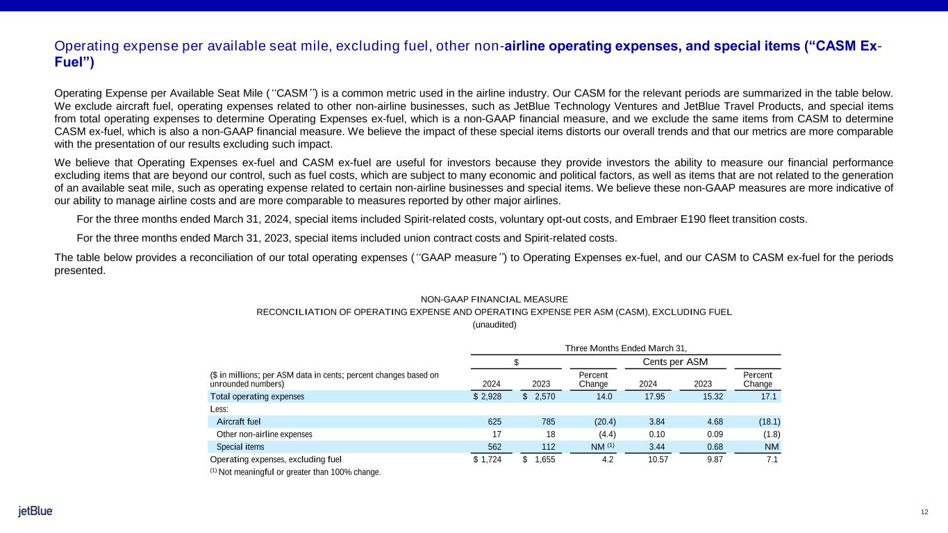 12 Operating expense per available seat mile, excluding fuel, other non-airline operating expenses, and special items (“CASM Ex- Fuel”) Operating Expense per Available Seat Mile (“CASM”) is a common metric used in the airline industry. Our CASM for the relevant periods are summarized in the table below. We exclude aircraft fuel, operating expenses related to other non-airline businesses, such as JetBlue Technology Ventures and JetBlue Travel Products, and special items from total operating expenses to determine Operating Expenses ex-fuel, which is a non-GAAP financial measure, and we exclude the same items from CASM to determine CASM ex-fuel, which is also a non-GAAP financial measure. We believe the impact of these special items distorts our overall trends and that our metrics are more comparable with the presentation of our results excluding such impact. We believe that Operating Expenses ex-fuel and CASM ex-fuel are useful for investors because they provide investors the ability to measure our financial performance excluding items that are beyond our control, such as fuel costs, which are subject to many economic and political factors, as well as items that are not related to the generation of an available seat mile, such as operating expense related to certain non-airline businesses and special items. We believe these non-GAAP measures are more indicative of our ability to manage airline costs and are more comparable to measures reported by other major airlines. For the three months ended March 31, 2024, special items included Spirit-related costs, voluntary opt-out costs, and Embraer E190 fleet transition costs. For the three months ended March 31, 2023, special items included union contract costs and Spirit-related costs. The table below provides a reconciliation of our total operating expenses (“GAAP measure”) to Operating Expenses ex-fuel, and our CASM to CASM ex-fuel for the periods presented. NON-GAAP FINANCIAL MEASURE RECONCILIATION OF OPERATING EXPENSE AND OPERATING EXPENSE PER ASM (CASM), EXCLUDING FUEL (unaudited) Three Months Ended March 31, $ Cents per ASM ($ in millions; per ASM data in cents; percent changes based on unrounded numbers) 2024 2023 Percent Change 2024 2023 Percent Change Total operating expenses $ 2,928 $ 2,570 14.0 17.95 15.32 17.1 Less: Aircraft fuel 625 785 (20.4) 3.84 4.68 (18.1) Other non-airline expenses 17 18 (4.4) 0.10 0.09 (1.8) Special items 562 112 NM (1) 3.44 0.68 NM Operating expenses, excluding fuel $ 1,724 $ 1,655 4.2 10.57 9.87 7.1 (1) Not meaningful or greater than 100% change.