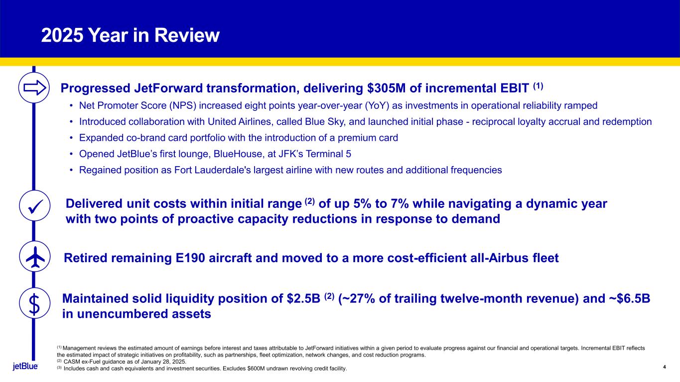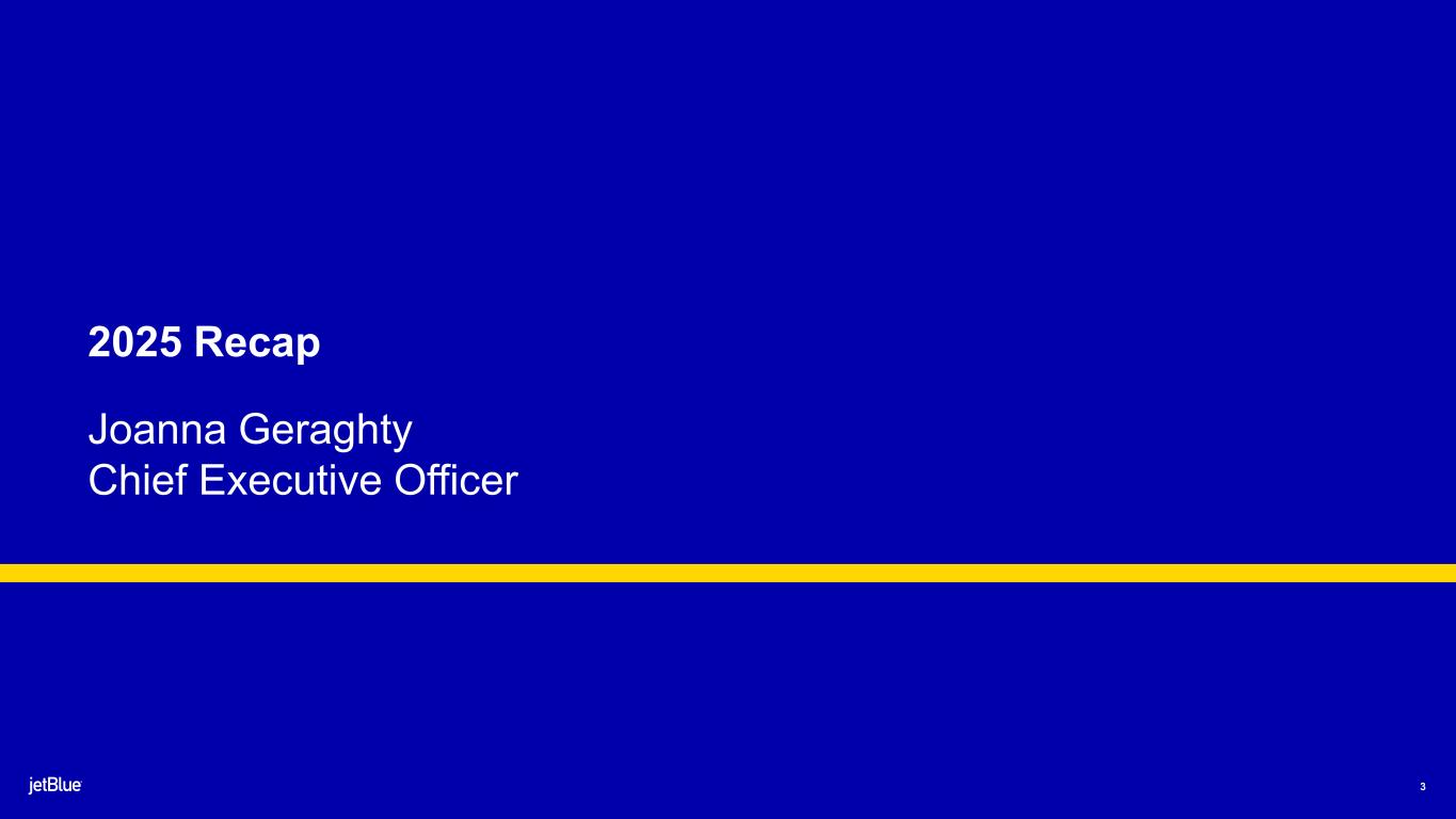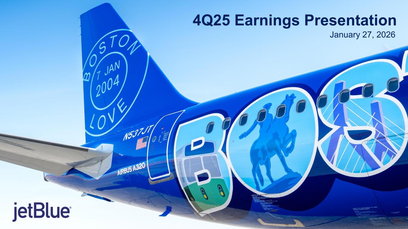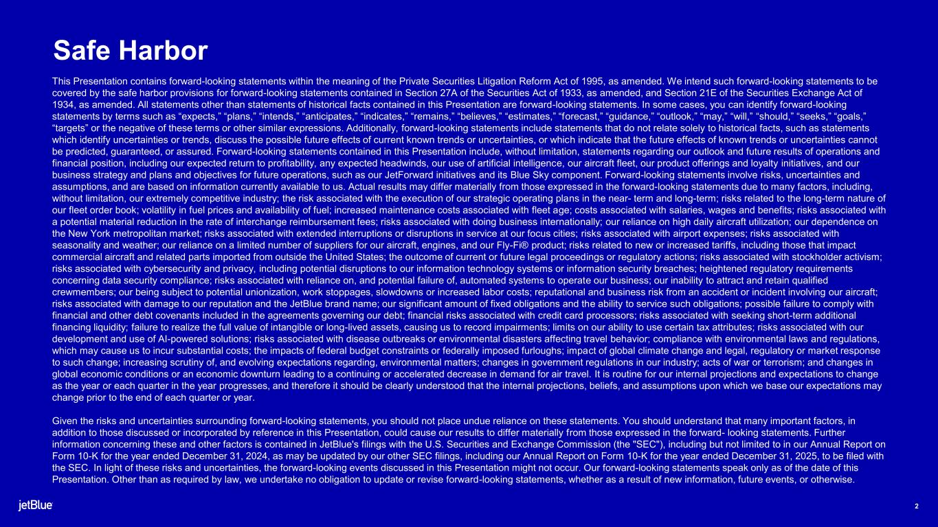 The JetBlue Way Forward | Our Strategic Evolution | Returning to Historical Earnings Power Safe Harbor This Presentation contains forward-looking statements within the meaning of the Private Securities Litigation Reform Act of 1995, as amended. We intend such forward-looking statements to be covered by the safe harbor provisions for forward-looking statements contained in Section 27A of the Securities Act of 1933, as amended, and Section 21E of the Securities Exchange Act of 1934, as amended. All statements other than statements of historical facts contained in this Presentation are forward-looking statements. In some cases, you can identify forward-looking statements by terms such as “expects,” “plans,” “intends,” “anticipates,” “indicates,” “remains,” “believes,” “estimates,” “forecast,” “guidance,” “outlook,” “may,” “will,” “should,” “seeks,” “goals,” “targets” or the negative of these terms or other similar expressions. Additionally, forward-looking statements include statements that do not relate solely to historical facts, such as statements which identify uncertainties or trends, discuss the possible future effects of current known trends or uncertainties, or which indicate that the future effects of known trends or uncertainties cannot be predicted, guaranteed, or assured. Forward-looking statements contained in this Presentation include, without limitation, statements regarding our outlook and future results of operations and financial position, including our expected return to profitability, any expected headwinds, our use of artificial intelligence, our aircraft fleet, our product offerings and loyalty initiatives, and our business strategy and plans and objectives for future operations, such as our JetForward initiatives and its Blue Sky component. Forward-looking statements involve risks, uncertainties and assumptions, and are based on information currently available to us. Actual results may differ materially from those expressed in the forward-looking statements due to many factors, including, without limitation, our extremely competitive industry; the risk associated with the execution of our strategic operating plans in the near- term and long-term; risks related to the long-term nature of our fleet order book; volatility in fuel prices and availability of fuel; increased maintenance costs associated with fleet age; costs associated with salaries, wages and benefits; risks associated with a potential material reduction in the rate of interchange reimbursement fees; risks associated with doing business internationally; our reliance on high daily aircraft utilization; our dependence on the New York metropolitan market; risks associated with extended interruptions or disruptions in service at our focus cities; risks associated with airport expenses; risks associated with seasonality and weather; our reliance on a limited number of suppliers for our aircraft, engines, and our Fly-Fi® product; risks related to new or increased tariffs, including those that impact commercial aircraft and related parts imported from outside the United States; the outcome of current or future legal proceedings or regulatory actions; risks associated with stockholder activism; risks associated with cybersecurity and privacy, including potential disruptions to our information technology systems or information security breaches; heightened regulatory requirements concerning data security compliance; risks associated with reliance on, and potential failure of, automated systems to operate our business; our inability to attract and retain qualified crewmembers; our being subject to potential unionization, work stoppages, slowdowns or increased labor costs; reputational and business risk from an accident or incident involving our aircraft; risks associated with damage to our reputation and the JetBlue brand name; our significant amount of fixed obligations and the ability to service such obligations; possible failure to comply with financial and other debt covenants included in the agreements governing our debt; financial risks associated with credit card processors; risks associated with seeking short-term additional financing liquidity; failure to realize the full value of intangible or long-lived assets, causing us to record impairments; limits on our ability to use certain tax attributes; risks associated with our development and use of AI-powered solutions; risks associated with disease outbreaks or environmental disasters affecting travel behavior; compliance with environmental laws and regulations, which may cause us to incur substantial costs; the impacts of federal budget constraints or federally imposed furloughs; impact of global climate change and legal, regulatory or market response to such change; increasing scrutiny of, and evolving expectations regarding, environmental matters; changes in government regulations in our industry; acts of war or terrorism; and changes in global economic conditions or an economic downturn leading to a continuing or accelerated decrease in demand for air travel. It is routine for our internal projections and expectations to change as the year or each quarter in the year progresses, and therefore it should be clearly understood that the internal projections, beliefs, and assumptions upon which we base our expectations may change prior to the end of each quarter or year. Given the risks and uncertainties surrounding forward-looking statements, you should not place undue reliance on these statements. You should understand that many important factors, in addition to those discussed or incorporated by reference in this Presentation, could cause our results to differ materially from those expressed in the forward- looking statements. Further information concerning these and other factors is contained in JetBlue's filings with the U.S. Securities and Exchange Commission (the "SEC"), including but
