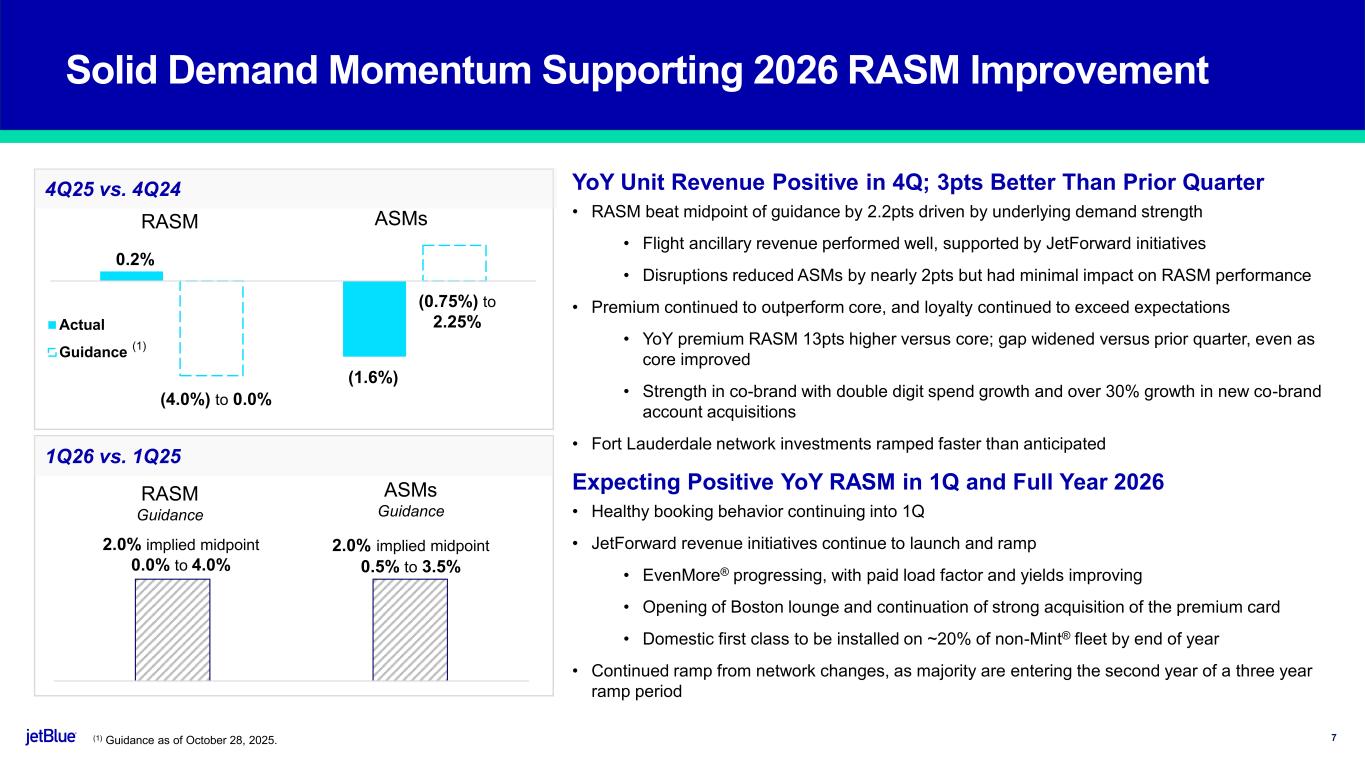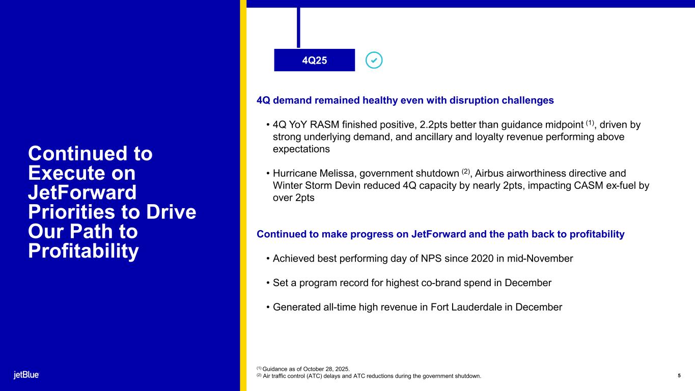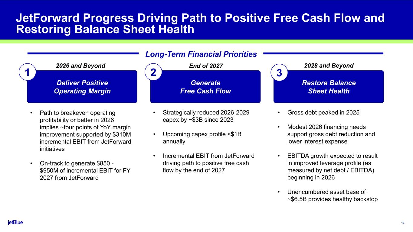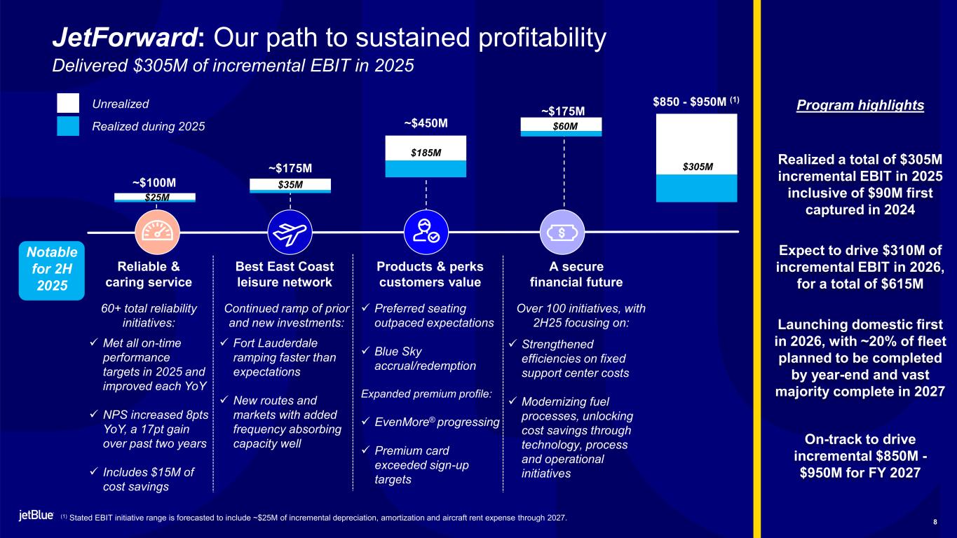 The JetBlue Way Forward | Our Strategic Evolution | Returning to Historical Earnings Power Safe Harbor This Presentation contains forward-looking statements within the meaning of the Private Securities Litigation Reform Act of 1995, as amended. We intend such forward-looking statements to be covered by the safe harbor provisions for forward-looking statements contained in Section 27A of the Securities Act of 1933, as amended, and Section 21E of the Securities Exchange Act of 1934, as amended. All statements other than statements of historical facts contained in this Presentation are forward-looking statements. In some cases, you can identify forward-looking statements by terms such as “expects,” “plans,” “intends,” “anticipates,” “indicates,” “remains,” “believes,” “estimates,” “forecast,” “guidance,” “outlook,” “may,” “will,” “should,” “seeks,” “goals,” “targets” or the negative of these terms or other similar expressions. Additionally, forward-looking statements include statements that do not relate solely to historical facts, such as statements which identify uncertainties or trends, discuss the possible future effects of current known trends or uncertainties, or which indicate that the future effects of known trends or uncertainties cannot be predicted, guaranteed, or assured. Forward-looking statements contained in this Presentation include, without limitation, statements regarding our outlook and future results of operations and financial position, including our expected return to profitability, any expected headwinds, our use of artificial intelligence, our aircraft fleet, our product offerings and loyalty initiatives, and our business strategy and plans and objectives for future operations, such as our JetForward initiatives and its Blue Sky component. Forward-looking statements involve risks, uncertainties and assumptions, and are based on information currently available to us. Actual results may differ materially from those expressed in the forward-looking statements due to many factors, including, without limitation, our extremely competitive industry; the risk associated with the execution of our strategic operating plans in the near- term and long-term; risks related to the long-term nature of our fleet order book; volatility in fuel prices and availability of fuel; increased maintenance costs associated with fleet age; costs associated with salaries, wages and benefits; risks associated with a potential material reduction in the rate of interchange reimbursement fees; risks associated with doing business internationally; our reliance on high daily aircraft utilization; our dependence on the New York metropolitan market; risks associated with extended interruptions or disruptions in service at our focus cities; risks associated with airport expenses; risks associated with seasonality and weather; our reliance on a limited number of suppliers for our aircraft, engines, and our Fly-Fi® product; risks related to new or increased tariffs, including those that impact commercial aircraft and related parts imported from outside the United States; the outcome of current or future legal proceedings or regulatory actions; risks associated with stockholder activism; risks associated with cybersecurity and privacy, including potential disruptions to our information technology systems or information security breaches; heightened regulatory requirements concerning data security compliance; risks associated with reliance on, and potential failure of, automated systems to operate our business; our inability to attract and retain qualified crewmembers; our being subject to potential unionization, work stoppages, slowdowns or increased labor costs; reputational and business risk from an accident or incident involving our aircraft; risks associated with damage to our reputation and the JetBlue brand name; our significant amount of fixed obligations and the ability to service such obligations; possible failure to comply with financial and other debt covenants included in the agreements governing our debt; financial risks associated with credit card processors; risks associated with seeking short-term additional financing liquidity; failure to realize the full value of intangible or long-lived assets, causing us to record impairments; limits on our ability to use certain tax attributes; risks associated with our development and use of AI-powered solutions; risks associated with disease outbreaks or environmental disasters affecting travel behavior; compliance with environmental laws and regulations, which may cause us to incur substantial costs; the impacts of federal budget constraints or federally imposed furloughs; impact of global climate change and legal, regulatory or market response to such change; increasing scrutiny of, and evolving expectations regarding, environmental matters; changes in government regulations in our industry; acts of war or terrorism; and changes in global economic conditions or an economic downturn leading to a continuing or accelerated decrease in demand for air travel. It is routine for our internal projections and expectations to change as the year or each quarter in the year progresses, and therefore it should be clearly understood that the internal projections, beliefs, and assumptions upon which we base our expectations may change prior to the end of each quarter or year. Given the risks and uncertainties surrounding forward-looking statements, you should not place undue reliance on these statements. You should understand that many important factors, in addition to those discussed or incorporated by reference in this Presentation, could cause our results to differ materially from those expressed in the forward- looking statements. Further information concerning these and other factors is contained in JetBlue's filings with the U.S. Securities and Exchange Commission (the "SEC"), including but