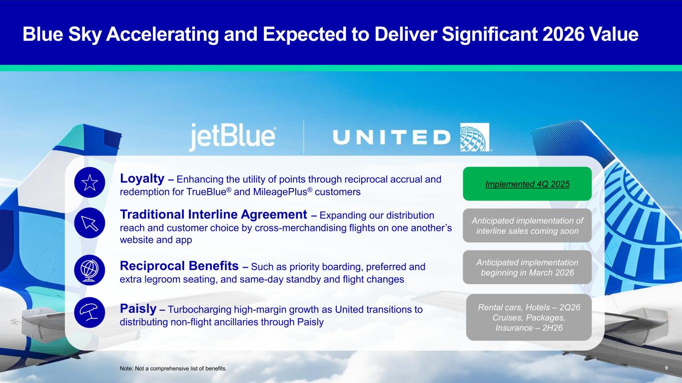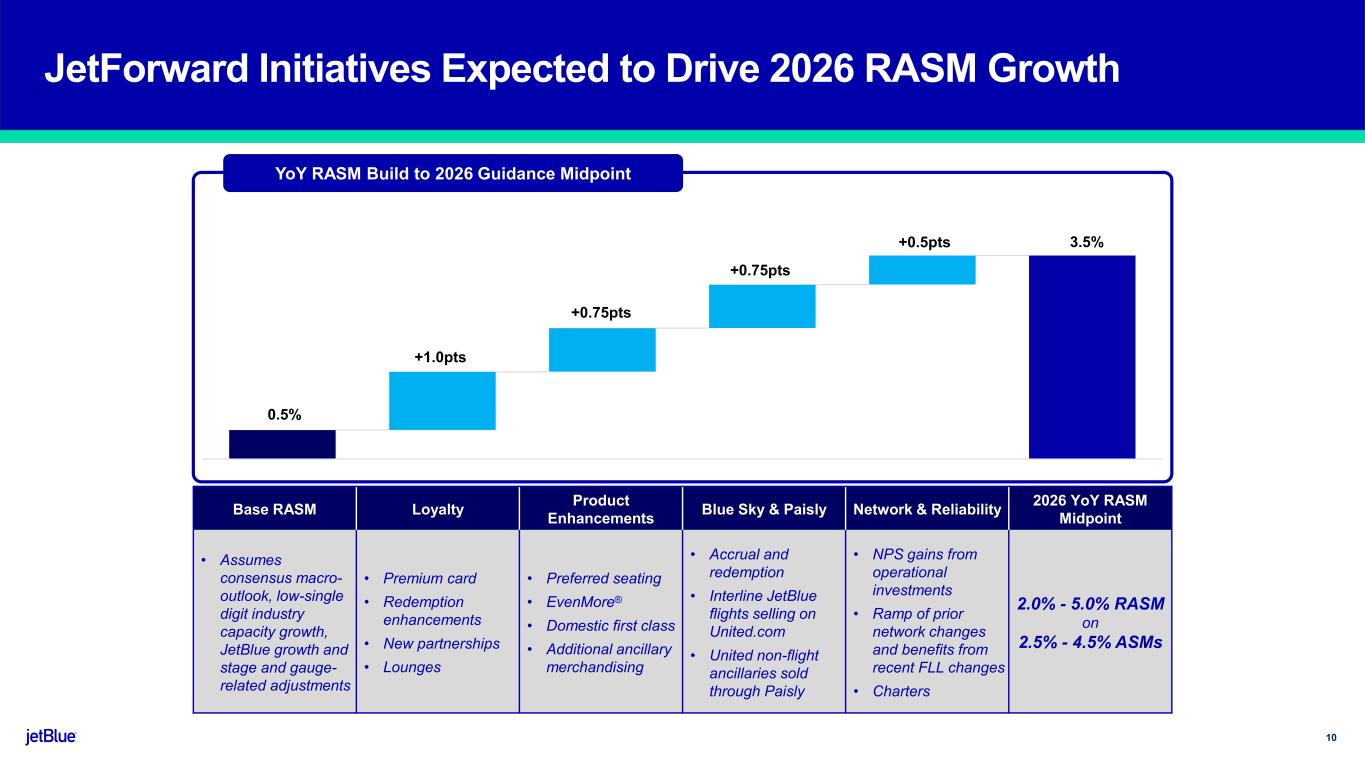 9Note: Not a comprehensive list of benefits. Traditional Interline Agreement – Expanding our distribution reach and customer choice by cross-merchandising flights on one another’s website and app Loyalty – Enhancing the utility of points through reciprocal accrual and redemption for TrueBlue® and MileagePlus® customers Paisly – Turbocharging high-margin growth as United transitions to distributing non-flight ancillaries through Paisly Blue Sky Accelerating and Expected to Deliver Significant 2026 Value Anticipated implementation of interline sales coming soon Implemented 4Q 2025 Rental cars, Hotels – 2Q26 Cruises, Packages, Insurance – 2H26 Reciprocal Benefits – Such as priority boarding, preferred and extra legroom seating, and same-day standby and flight changes Anticipated implementation beginning in March 2026