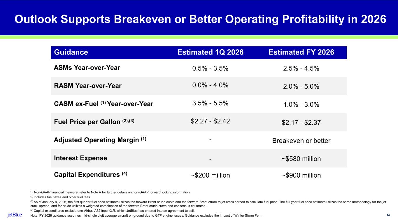 14 (1) Non-GAAP financial measure; refer to Note A for further details on non-GAAP forward looking information. (2) Includes fuel taxes and other fuel fees. (3) As of January 9, 2026, the first quarter fuel price estimate utilizes the forward Brent crude curve and the forward Brent crude to jet crack spread to calculate fuel price. The full year fuel price estimate utilizes the same methodology for the jet crack spread, and for crude utilizes a weighted combination of the forward Brent crude curve and consensus estimates. (4) Capital expenditures exclude one Airbus A321neo XLR, which JetBlue has entered into an agreement to sell. Note: FY 2026 guidance assumes mid-single digit average aircraft on ground due to GTF engine issues. Guidance excludes the impact of Winter Storm Fern. Guidance Estimated 1Q 2026 Estimated FY 2026 ASMs Year-over-Year 0.5% - 3.5% 2.5% - 4.5% RASM Year-over-Year 0.0% - 4.0% 2.0% - 5.0% CASM ex-Fuel (1) Year-over-Year 3.5% - 5.5% 1.0% - 3.0% Fuel Price per Gallon (2),(3) $2.27 - $2.42 $2.17 - $2.37 Adjusted Operating Margin (1) - Breakeven or better Interest Expense - ~$580 million Capital Expenditures (4) ~$200 million ~$900 million Outlook Supports Breakeven or Better Operating Profitability in 2026