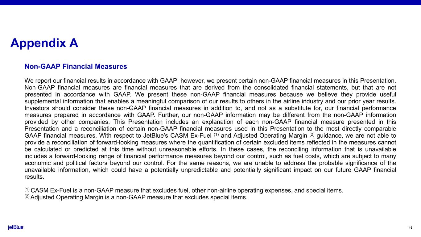 Non-GAAP Financial Measures We report our financial results in accordance with GAAP; however, we present certain non-GAAP financial measures in this Presentation. Non-GAAP financial measures are financial measures that are derived from the consolidated financial statements, but that are not presented in accordance with GAAP. We present these non-GAAP financial measures because we believe they provide useful supplemental information that enables a meaningful comparison of our results to others in the airline industry and our prior year results. Investors should consider these non-GAAP financial measures in addition to, and not as a substitute for, our financial performance measures prepared in accordance with GAAP. Further, our non-GAAP information may be different from the non-GAAP information provided by other companies. This Presentation includes an explanation of each non-GAAP financial measure presented in this Presentation and a reconciliation of certain non-GAAP financial measures used in this Presentation to the most directly comparable GAAP financial measures. With respect to JetBlue’s CASM Ex-Fuel (1) and Adjusted Operating Margin (2) guidance, we are not able to provide a reconciliation of forward-looking measures where the quantification of certain excluded items reflected in the measures cannot be calculated or predicted at this time without unreasonable efforts. In these cases, the reconciling information that is unavailable includes a forward-looking range of financial performance measures beyond our control, such as fuel costs, which are subject to many economic and political factors beyond our control. For the same reasons, we are unable to address the probable significance of the unavailable information, which could have a potentially unpredictable and potentially significant impact on our future GAAP financial results. (1) CASM Ex-Fuel is a non-GAAP measure that excludes fuel, other non-airline operating expenses, and special items. (2) Adjusted Operating Margin is a non-GAAP measure that excludes special items. Appendix A 16