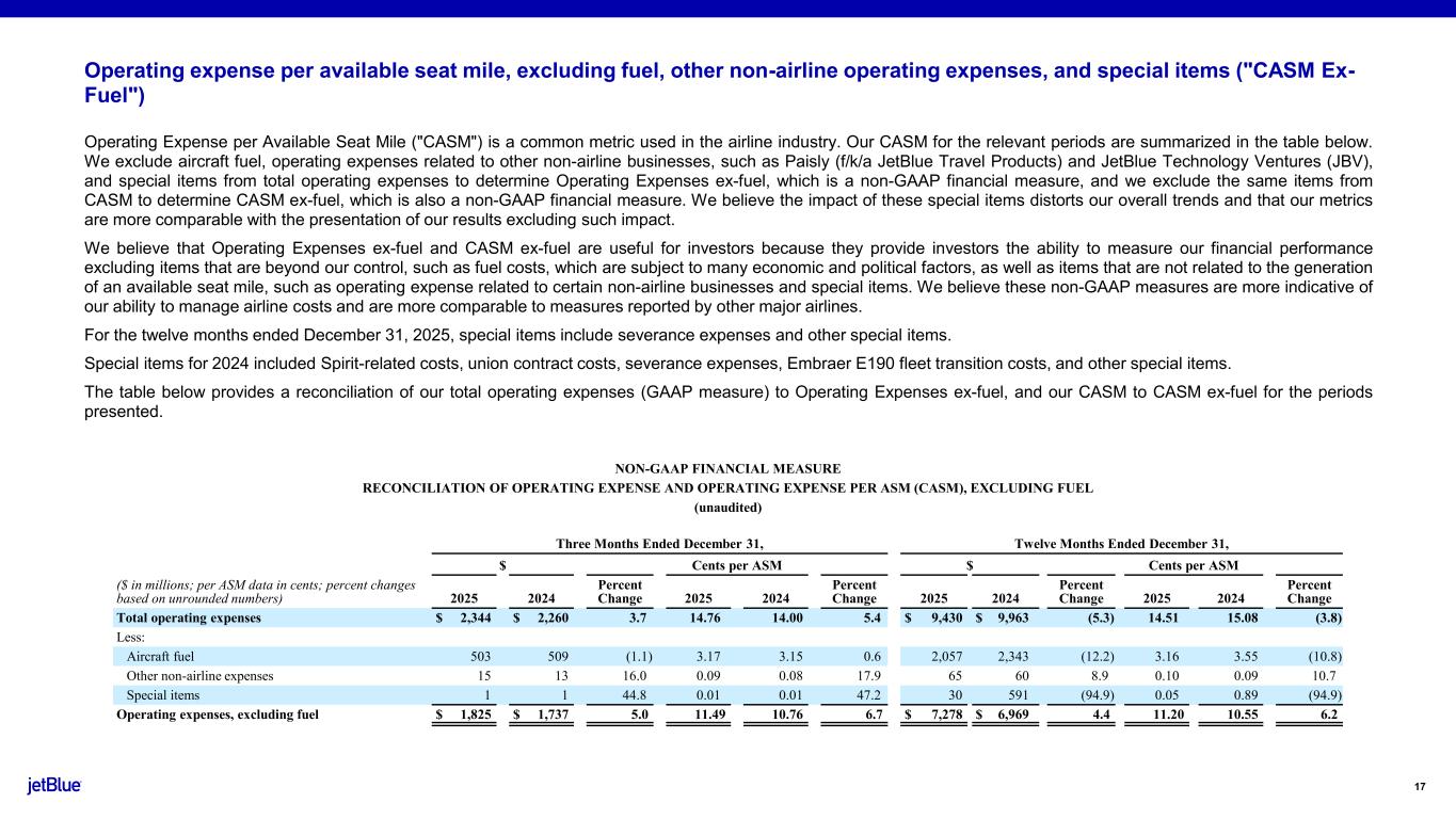 Operating expense per available seat mile, excluding fuel, other non-airline operating expenses, and special items ("CASM Ex- Fuel") Operating Expense per Available Seat Mile ("CASM") is a common metric used in the airline industry. Our CASM for the relevant periods are summarized in the table below. We exclude aircraft fuel, operating expenses related to other non-airline businesses, such as Paisly (f/k/a JetBlue Travel Products) and JetBlue Technology Ventures (JBV), and special items from total operating expenses to determine Operating Expenses ex-fuel, which is a non-GAAP financial measure, and we exclude the same items from CASM to determine CASM ex-fuel, which is also a non-GAAP financial measure. We believe the impact of these special items distorts our overall trends and that our metrics are more comparable with the presentation of our results excluding such impact. We believe that Operating Expenses ex-fuel and CASM ex-fuel are useful for investors because they provide investors the ability to measure our financial performance excluding items that are beyond our control, such as fuel costs, which are subject to many economic and political factors, as well as items that are not related to the generation of an available seat mile, such as operating expense related to certain non-airline businesses and special items. We believe these non-GAAP measures are more indicative of our ability to manage airline costs and are more comparable to measures reported by other major airlines. For the twelve months ended December 31, 2025, special items include severance expenses and other special items. Special items for 2024 included Spirit-related costs, union contract costs, severance expenses, Embraer E190 fleet transition costs, and other special items. The table below provides a reconciliation of our total operating expenses (GAAP measure) to Operating Expenses ex-fuel, and our CASM to CASM ex-fuel for the periods presented. NON-GAAP FINANCIAL MEASURE RECONCILIATION OF OPERATING EXPENSE AND OPERATING EXPENSE PER ASM (CASM), EXCLUDING FUEL (unaudited) Three Months Ended December 31, Twelve Months Ended December 31, $ Cents per ASM $ Cents per ASM ($ in millions; per ASM data in cents; percent changes based on unrounded numbers) 2025 2024 Percent Change 2025 2024 Percent Change 2025 2024 Percent Change 2025 2024 Percent Change Total operating expenses $ 2,344 $ 2,260 3.7 14.76 14.00 5.4 $ 9,430 $ 9,963 (5.3) 14.51 15.08 (3.8) Less: Aircraft fuel 503 509 (1.1) 3.17 3.15 0.6 2,057 2,343 (12.2) 3.16 3.55 (10.8) Other non-airline expenses 15 13 16.0 0.09 0.08 17.9 65 60 8.9 0.10 0.09 10.7 Special items 1 1 44.8 0.01 0.01 47.2 30 591 (94.9) 0.05 0.89 (94.9) Operating expenses, excluding fuel $ 1,825 $ 1,737 5.0 11.49 10.76 6.7 $ 7,278 $ 6,969 4.4 11.20 10.55 6.2 17