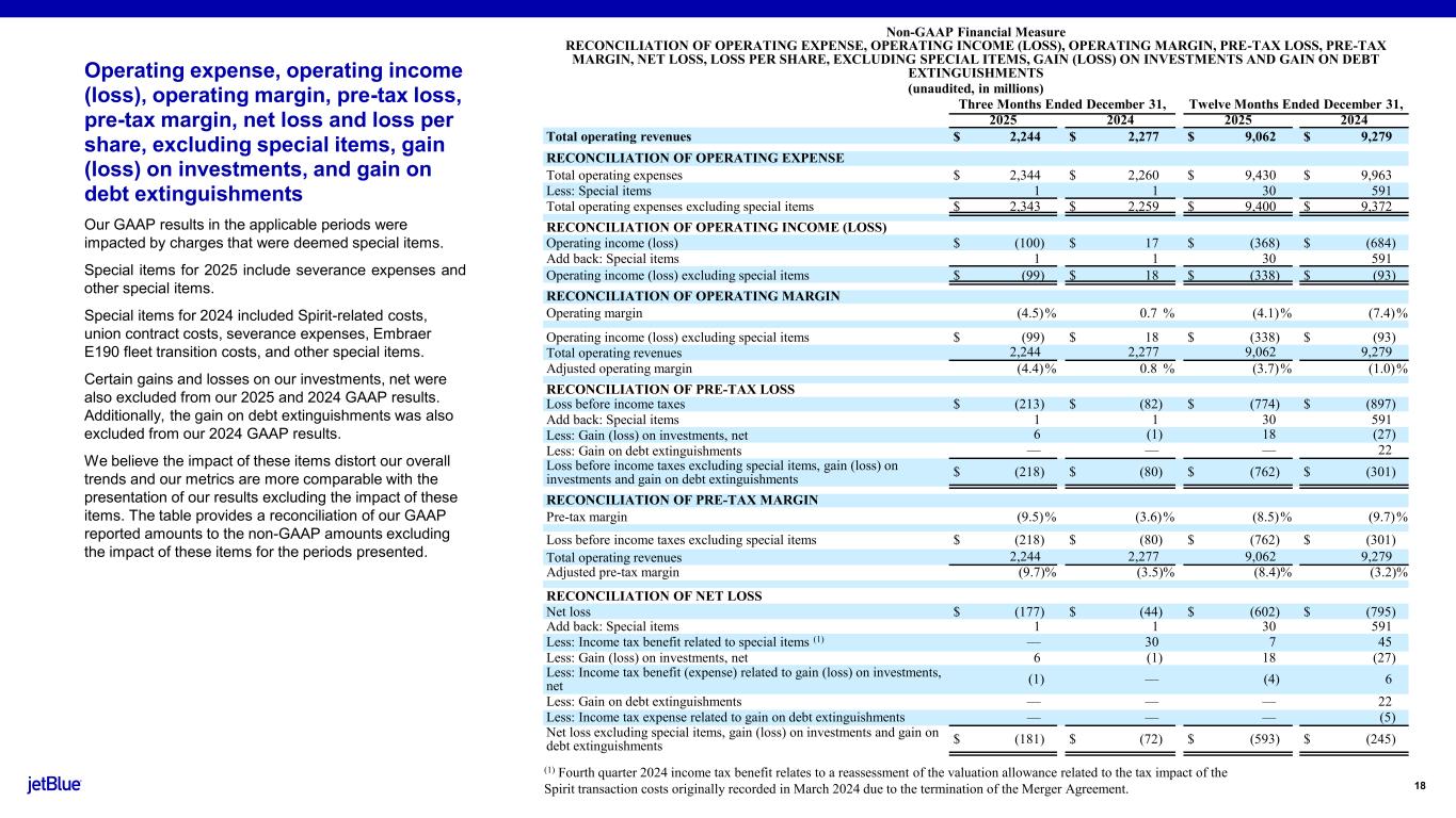 Operating expense, operating income (loss), operating margin, pre-tax loss, pre-tax margin, net loss and loss per share, excluding special items, gain (loss) on investments, and gain on debt extinguishments Our GAAP results in the applicable periods were impacted by charges that were deemed special items. Special items for 2025 include severance expenses and other special items. Special items for 2024 included Spirit-related costs, union contract costs, severance expenses, Embraer E190 fleet transition costs, and other special items. Certain gains and losses on our investments, net were also excluded from our 2025 and 2024 GAAP results. Additionally, the gain on debt extinguishments was also excluded from our 2024 GAAP results. We believe the impact of these items distort our overall trends and our metrics are more comparable with the presentation of our results excluding the impact of these items. The table provides a reconciliation of our GAAP reported amounts to the non-GAAP amounts excluding the impact of these items for the periods presented. Non-GAAP Financial Measure RECONCILIATION OF OPERATING EXPENSE, OPERATING INCOME (LOSS), OPERATING MARGIN, PRE-TAX LOSS, PRE-TAX MARGIN, NET LOSS, LOSS PER SHARE, EXCLUDING SPECIAL ITEMS, GAIN (LOSS) ON INVESTMENTS AND GAIN ON DEBT EXTINGUISHMENTS (unaudited, in millions) Three Months Ended December 31, Twelve Months Ended December 31, 2025 2024 2025 2024 Total operating revenues $ 2,244 $ 2,277 $ 9,062 $ 9,279 RECONCILIATION OF OPERATING EXPENSE Total operating expenses $ 2,344 $ 2,260 $ 9,430 $ 9,963 Less: Special items 1 1 30 591 Total operating expenses excluding special items $ 2,343 $ 2,259 $ 9,400 $ 9,372 RECONCILIATION OF OPERATING INCOME (LOSS) Operating income (loss) $ (100) $ 17 $ (368) $ (684) Add back: Special items 1 1 30 591 Operating income (loss) excluding special items $ (99) $ 18 $ (338) $ (93) RECONCILIATION OF OPERATING MARGIN Operating margin (4.5)% 0.7 % (4.1)% (7.4)% Operating income (loss) excluding special items $ (99) $ 18 $ (338) $ (93) Total operating revenues 2,244 2,277 9,062 9,279 Adjusted operating margin (4.4)% 0.8 % (3.7)% (1.0)% RECONCILIATION OF PRE-TAX LOSS Loss before income taxes $ (213) $ (82) $ (774) $ (897) Add back: Special items 1 1 30 591 Less: Gain (loss) on investments, net 6 (1) 18 (27) Less: Gain on debt extinguishments — — — 22 Loss before income taxes excluding special items, gain (loss) on investments and gain on debt extinguishments $ (218) $ (80) $ (762) $ (301) RECONCILIATION OF PRE-TAX MARGIN Pre-tax margin (9.5)% (3.6)% (8.5)% (9.7)% Loss before income taxes excluding special items $ (218) $ (80) $ (762) $ (301) Total operating revenues 2,244 2,277 9,062 9,279 Adjusted pre-tax margin (9.7)% (3.5)% (8.4)% (3.2)% RECONCILIATION OF NET LOSS Net loss $ (177) $ (44) $ (602) $ (795) Add back: Special items 1 1 30 591 Less: Income tax benefit related to special items (1) — 30 7 45 Less: Gain (loss) on investments, net 6 (1) 18 (27) Less: Income tax benefit (expense) related to gain (loss) on investments, net (1) — (4) 6 Less: Gain on debt extinguishments — — — 22 Less: Income tax expense related to gain on debt extinguishments — — — (5) Net loss excluding special items, gain (loss) on investments and gain on debt extinguishments $ (181) $ (72) $ (593) $ (245) 18 (1) Fourth quarter 2024 income tax benefit relates to a reassessment of the valuation allowance related to the tax impact of the Spirit transaction costs originally recorded in March 2024 due to the termination of the Merger Agreement.