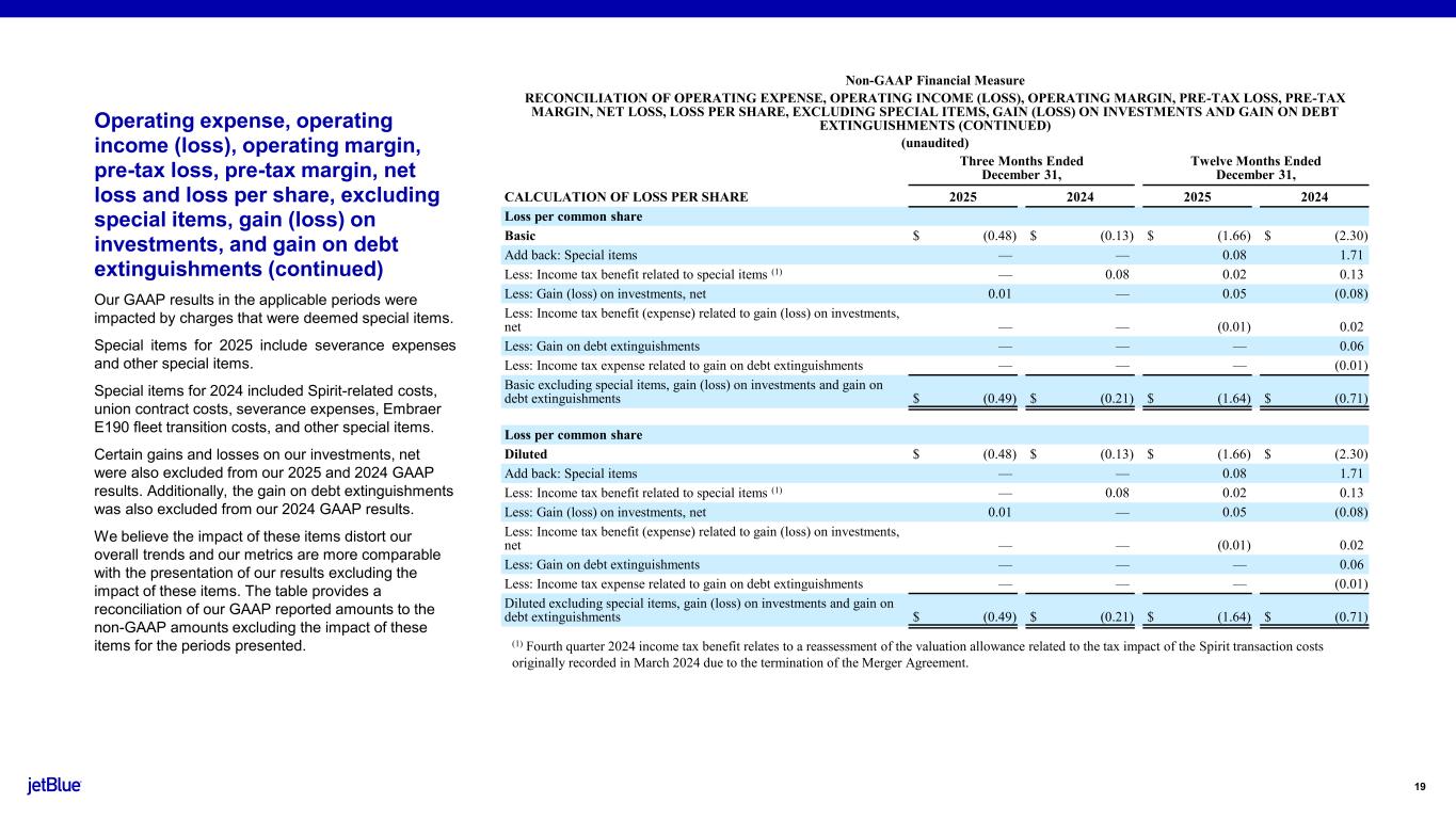 Operating expense, operating income (loss), operating margin, pre-tax loss, pre-tax margin, net loss and loss per share, excluding special items, gain (loss) on investments, and gain on debt extinguishments (continued) Our GAAP results in the applicable periods were impacted by charges that were deemed special items. Special items for 2025 include severance expenses and other special items. Special items for 2024 included Spirit-related costs, union contract costs, severance expenses, Embraer E190 fleet transition costs, and other special items. Certain gains and losses on our investments, net were also excluded from our 2025 and 2024 GAAP results. Additionally, the gain on debt extinguishments was also excluded from our 2024 GAAP results. We believe the impact of these items distort our overall trends and our metrics are more comparable with the presentation of our results excluding the impact of these items. The table provides a reconciliation of our GAAP reported amounts to the non-GAAP amounts excluding the impact of these items for the periods presented. Non-GAAP Financial Measure RECONCILIATION OF OPERATING EXPENSE, OPERATING INCOME (LOSS), OPERATING MARGIN, PRE-TAX LOSS, PRE-TAX MARGIN, NET LOSS, LOSS PER SHARE, EXCLUDING SPECIAL ITEMS, GAIN (LOSS) ON INVESTMENTS AND GAIN ON DEBT EXTINGUISHMENTS (CONTINUED) (unaudited) Three Months Ended December 31, Twelve Months Ended December 31, CALCULATION OF LOSS PER SHARE 2025 2024 2025 2024 Loss per common share Basic $ (0.48) $ (0.13) $ (1.66) $ (2.30) Add back: Special items — — 0.08 1.71 Less: Income tax benefit related to special items (1) — 0.08 0.02 0.13 Less: Gain (loss) on investments, net 0.01 — 0.05 (0.08) Less: Income tax benefit (expense) related to gain (loss) on investments, net — — (0.01) 0.02 Less: Gain on debt extinguishments — — — 0.06 Less: Income tax expense related to gain on debt extinguishments — — — (0.01) Basic excluding special items, gain (loss) on investments and gain on debt extinguishments $ (0.49) $ (0.21) $ (1.64) $ (0.71) Loss per common share Diluted $ (0.48) $ (0.13) $ (1.66) $ (2.30) Add back: Special items — — 0.08 1.71 Less: Income tax benefit related to special items (1) — 0.08 0.02 0.13 Less: Gain (loss) on investments, net 0.01 — 0.05 (0.08) Less: Income tax benefit (expense) related to gain (loss) on investments, net — — (0.01) 0.02 Less: Gain on debt extinguishments — — — 0.06 Less: Income tax expense related to gain on debt extinguishments — — — (0.01) Diluted excluding special items, gain (loss) on investments and gain on debt extinguishments $ (0.49) $ (0.21) $ (1.64) $ (0.71) (1) Fourth quarter 2024 income tax benefit relates to a reassessment of the valuation allowance related to the tax impact of the Spirit transaction costs originally recorded in March 2024 due to the termination of the Merger Agreement. 19