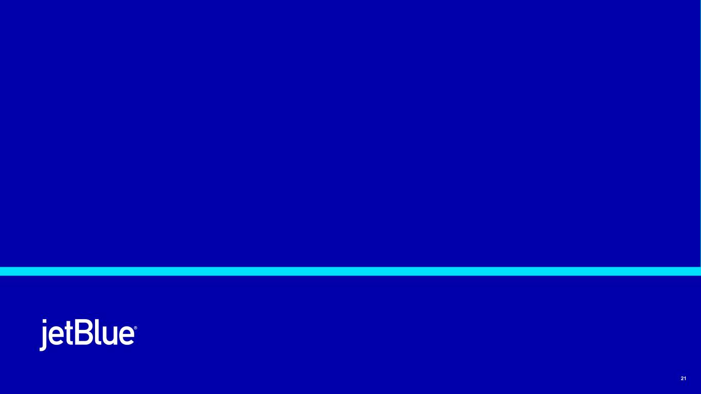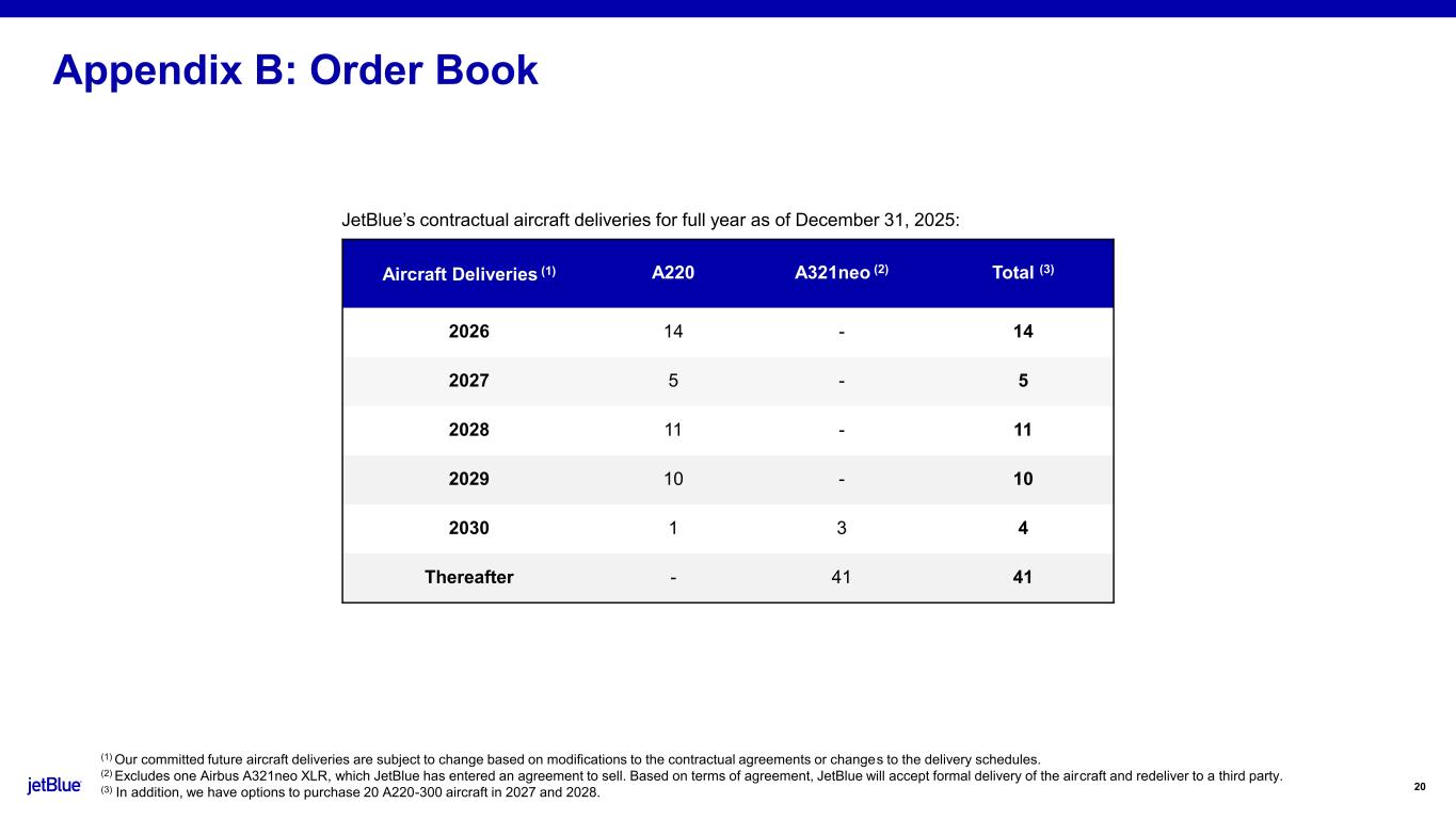 20 Aircraft Deliveries (1) A220 A321neo (2) Total (3) 2026 14 - 14 2027 5 - 5 2028 11 - 11 2029 10 - 10 2030 1 3 4 Thereafter - 41 41 (1) Our committed future aircraft deliveries are subject to change based on modifications to the contractual agreements or changes to the delivery schedules. (2) Excludes one Airbus A321neo XLR, which JetBlue has entered an agreement to sell. Based on terms of agreement, JetBlue will accept formal delivery of the aircraft and redeliver to a third party. (3) In addition, we have options to purchase 20 A220-300 aircraft in 2027 and 2028. JetBlue’s contractual aircraft deliveries for full year as of December 31, 2025: Appendix B: Order Book
