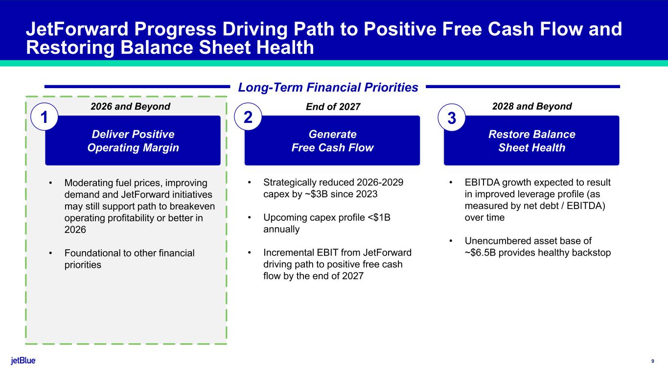 The JetBlue Way Forward | Our Strategic Evolution | Returning to Historical Earnings Power Safe Harbor This Presentation contains forward-looking statements within the meaning of the Private Securities Litigation Reform Act of 1995, as amended. We intend such forward-looking statements to be covered by the safe harbor provisions for forward-looking statements contained in Section 27A of the Securities Act of 1933, as amended, and Section 21E of the Securities Exchange Act of 1934, as amended. All statements other than statements of historical facts contained in this Presentation are forward-looking statements. In some cases, you can identify forward-looking statements by terms such as “expects,” “plans,” “intends,” “anticipates,” “indicates,” “remains,” “believes,” “estimates,” “forecast,” “guidance,” “outlook,” “may,” “will,” “should,” “seeks,” “goals,” “targets” or the negative of these terms or other similar expressions. Additionally, forward-looking statements include statements that do not relate solely to historical facts, such as statements which identify uncertainties or trends, discuss the possible future effects of current known trends or uncertainties, or which indicate that the future effects of known trends or uncertainties cannot be predicted, guaranteed, or assured. Forward-looking statements contained in this Presentation include, without limitation, statements regarding our outlook and future results of operations and financial position, including our expected return to profitability, any expected headwinds, our use of artificial intelligence, our aircraft fleet, our product offerings and loyalty initiatives, and our business strategy and plans and objectives for future operations. Forward-looking statements involve risks, uncertainties and assumptions, and are based on information currently available to us. Actual results may differ materially from those expressed in the forward-looking statements due to many factors, including, without limitation, our extremely competitive industry; the risk associated with the execution of our strategic operating plans in the near- term and long-term; risks related to the long-term nature of our fleet order book; volatility in fuel prices and availability of fuel; increased maintenance costs associated with fleet age; costs associated with salaries, wages and benefits; risks associated with a potential material reduction in the rate of interchange reimbursement fees; risks associated with doing business internationally; our reliance on high daily aircraft utilization; our dependence on the New York metropolitan market; risks associated with extended interruptions or disruptions in service at our focus cities; risks associated with airport expenses; risks associated with seasonality and weather; our reliance on a limited number of suppliers for our aircraft, engines, and our Fly-Fi® product; risks related to new or increased tariffs, including those that impact commercial aircraft and related parts imported from outside the United States; the outcome of current or future legal proceedings or regulatory actions; risks associated with stockholder activism; risks associated with cybersecurity and privacy, including potential disruptions to our information technology systems or information security breaches; heightened regulatory requirements concerning data security compliance; risks associated with reliance on, and potential failure of, automated systems to operate our business; our inability to attract and retain qualified crewmembers; our being subject to potential unionization, work stoppages, slowdowns or increased labor costs; reputational and business risk from an accident or incident involving our aircraft; risks associated with damage to our reputation and the JetBlue brand name; our significant amount of fixed obligations and the ability to service such obligations; possible failure to comply with financial and other debt covenants included in the agreements governing our debt; financial risks associated with credit card processors; risks associated with seeking short-term additional financing liquidity; failure to realize the full value of intangible or long- lived assets, causing us to record impairments; limits on our ability to use certain tax attributes; risks associated with our development and use of AI-powered solutions; risks associated with disease outbreaks or environmental disasters affecting travel behavior; compliance with environmental laws and regulations, which may cause us to incur substantial costs; the impacts of federal budget constraints or federally imposed furloughs; impact of global climate change and legal, regulatory or market response to such change; increasing scrutiny of, and evolving expectations regarding, environmental matters; changes in government regulations in our industry; acts of war or terrorism; and changes in global economic conditions or an economic downturn leading to a continuing or accelerated decrease in demand for air travel. It is routine for our internal projections and expectations to change as the year or each quarter in the year progresses, and therefore it should be clearly understood that the internal projections, beliefs, and assumptions upon which we base our expectations may change prior to the end of each quarter or year. Given the risks and uncertainties surrounding forward-looking statements, you should not place undue reliance on these statements. You should understand that many important factors, in addition to those discussed or incorporated by reference in this Presentation, could cause our results to differ materially from those expressed in the forward- looking statements. Further information concerning these and other factors is contained in JetBlue's filings with the U.S. Securities and Exchange Commission (the "SEC"), including but not limited to in our Annual Report on Form 10-K for the year