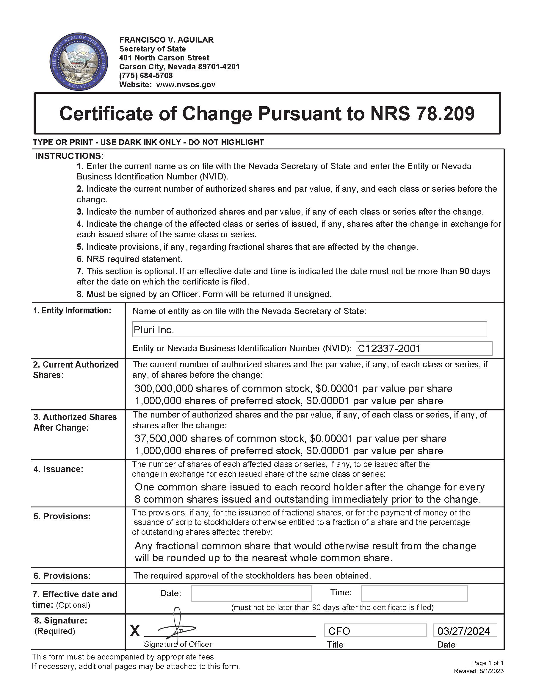 FRANCISCO V. AGUILAR Secretary of State 401 North Carson Street Carson City, Nevada 89701 - 4201 (775) 684 - 5708 Website: www.nvsos.gov Certificate of Change Pursuant to NRS 78.209 TYPE OR PRINT - USE DARK INK ONLY - DO NOT HIGHLIGHT This form must be accompanied by appropriate fees. If necessary, additional pages may be attached to this form. Page 1 of 1 Revised: 8/1/2023 INSTRUCTIONS: 1. Enter the current name as on file with the Nevada Secretary of State and enter the Entity or Nevada Business Identification Number (NVID). 2. Indicate the current number of authorized shares and par value, if any, and each class or series before the change. 3. Indicate the number of authorized shares and par value, if any of each class or series after the change. 4. Indicate the change of the affected class or series of issued, if any, shares after the change in exchange for each issued share of the same class or series. 5. Indicate provisions, if any, regarding fractional shares that are affected by the change. 6. NRS required statement. 7. This section is optional. If an effective date and time is indicated the date must not be more than 90 days after the date on which the certificate is filed. 8. Must be signed by an Officer. Form will be returned if unsigned. Name of entity as on file with the Nevada Secretary of State: Pluri Inc. Entity or Nevada Business Identification Number (NVID): C12337 - 2001 1. Entity Information: The current number of authorized shares and the par value, if any, of each class or series, if any, of shares before the change: 300,000,000 shares of common stock, $0.00001 par value per share 1,000,000 shares of preferred stock, $0.00001 par value per share 2. Current Authorized Shares: The number of authorized shares and the par value, if any, of each class or series, if any, of shares after the change: 37,500,000 shares of common stock, $0.00001 par value per share 1,000,000 shares of preferred stock, $0.00001 par value per share 3. Authorized Shares After Change: The number of shares of each affected class or series, if any, to be issued after the change in exchange for each issued share of the same class or series: One common share issued to each record holder after the change for every 8 common shares issued and outstanding immediately prior to the change. 4. Issuance: The provisions, if any, for the issuance of fractional shares, or for the payment of money or the issuance of scrip to stockholders otherwise entitled to a fraction of a share and the percentage of outstanding shares affected thereby : Any fractional common share that would otherwise result from the change will be rounded up to the nearest whole common share. 5. Provisions: The required approval of the stockholders has been obtained. 6. Provisions: Date: Time: (must not be later than 90 days after the certificate is filed) 7. Effective date and time: (Optional) X CFO 03/27/2024 Signature of Officer Title Date 8. Signature: (Required)