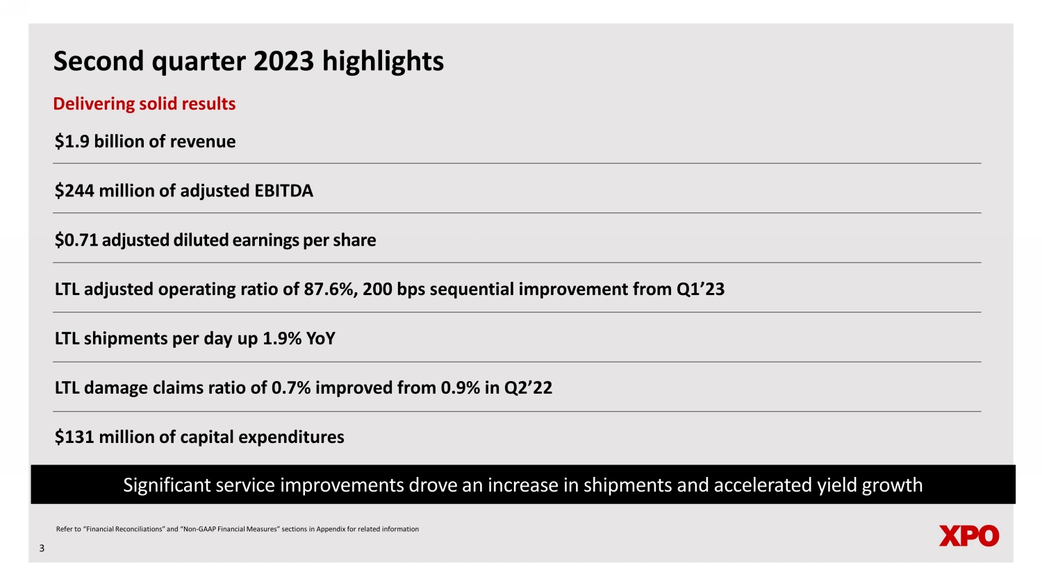 2 Forward - looking statements This document includes forward - looking statements within the meaning of Section 27 A of the Securities Act of 1933 , as amended, and Section 21 E of the Securities Exchange Act of 1934 , as amended, including statements relating to our full year 2023 expectations of gross capex, interest expense, pension income, effective tax rate, and diluted share count, and future financial targets of North American LTL revenue CAGR, adjusted EBITDA CAGR, adjusted operating ratio improvement, and return on invested capital (ROIC) . All statements other than statements of historical fact are, or may be deemed to be, forward - looking statements . In some cases, forward - looking statements can be identified by the use of forward - looking terms such as “anticipate,” “estimate,” “believe,” “continue,” “could,” “intend,” “may,” “plan,” “potential,” “predict,” “should,” “will,” “expect,” “objective,” “projection,” “forecast,” “goal,” “guidance,” “outlook,” “effort,” “target,” “trajectory” or the negative of these terms or other comparable terms . These forward - looking statements are based on certain assumptions and analyses made by us in light of our experience and our perception of historical trends, current conditions and expected future developments, as well as other factors we believe are appropriate in the circumstances . These forward - looking statements are subject to known and unknown risks, uncertainties and assumptions that may cause actual results, levels of activity, performance or achievements to be materially different from any future results, levels of activity, performance or achievements expressed or implied by such forward - looking statements . Factors that might cause or contribute to a material difference include the risks discussed in our filings with the SEC, and the following : the effects of business, economic, political, legal, and regulatory impacts or conflicts upon our operations ; supply chain disruptions, the global shortage of certain components such as semiconductor chips, strains on production or extraction of raw materials, cost inflation and labor and equipment shortages ; our ability to align our investments in capital assets, including equipment, service centers, and warehouses and other network facilities, to our customers’ demands ; our ability to implement our cost and revenue initiatives ; the effectiveness of our action plan, and other management actions, to improve our North American LTL business ; our ability to benefit from a sale or other divestiture of one or more business units ; our ability to successfully integrate and realize anticipated synergies, cost savings and profit improvement opportunities with respect to acquired and spun - off companies ; goodwill impairment, including in connection with a business unit sale or other divestiture ; fluctuations in currency exchange rates ; fuel price and fuel surcharge changes ; the expected benefits of the spin - off of RXO, Inc .; the impact of the prior spin - offs of GXO Logistics, Inc . and RXO, Inc . on the size and business diversity of our company ; our ability to develop and implement suitable information technology systems and prevent failures in or breaches of such systems ; our indebtedness ; our ability to raise debt and equity capital ; fluctuations in fixed and floating interest rates ; our ability to maintain positive relationships with our network of third - party transportation providers ; our ability to attract and retain qualified drivers ; labor matters ; litigation ; risks associated with our self - insured claims ; governmental or political actions ; and competition and pricing pressures . All forward - looking statements set forth in this document are qualified by these cautionary statements and there can be no assurance that the actual results or developments anticipated by us will be realized or, even if substantially realized, that they will have the expected consequences to or effects on us or our business or operations . Forward - looking statements set forth in this document speak only as of the date hereof, and we do not undertake any obligation to update forward - looking statements except to the extent required by law . Non - GAAP financial measures This presentation contains non - GAAP financial measures . For a description of these non - GAAP financial measures, including a reconciliation to the most comparable measure under GAAP, see the Appendix to this presentation .